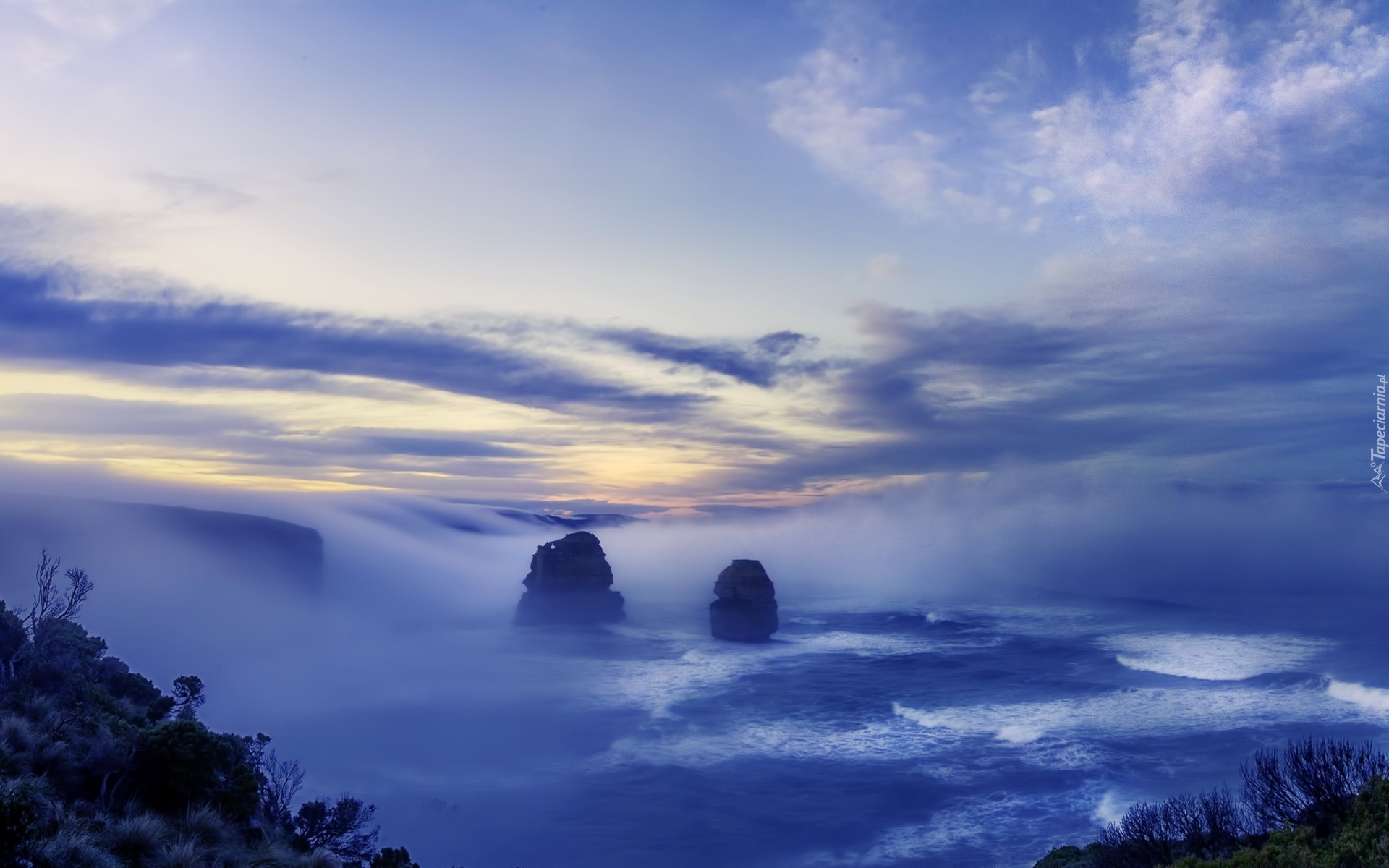 Edytor tapety: Rzeka, Mgła, Chmury, Skały