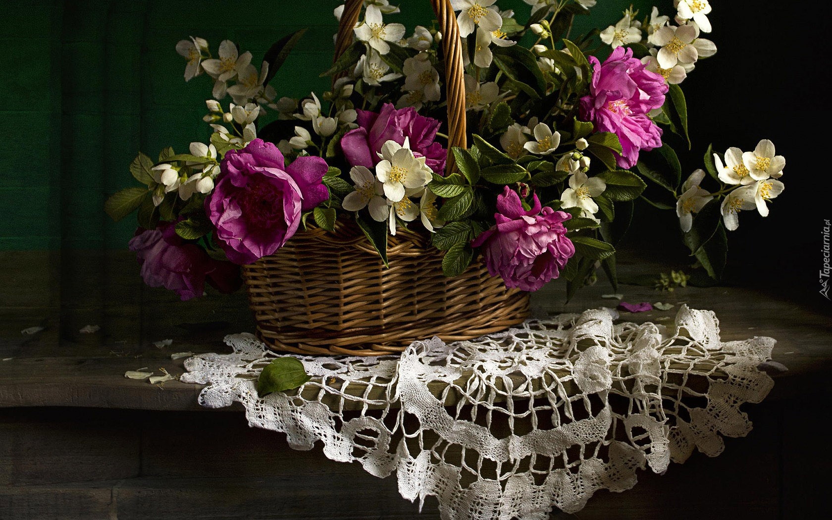 Edytor tapety: Kompozycja, Kwiaty, Koszyk, Serweta, Piwonie, Jaśmin
