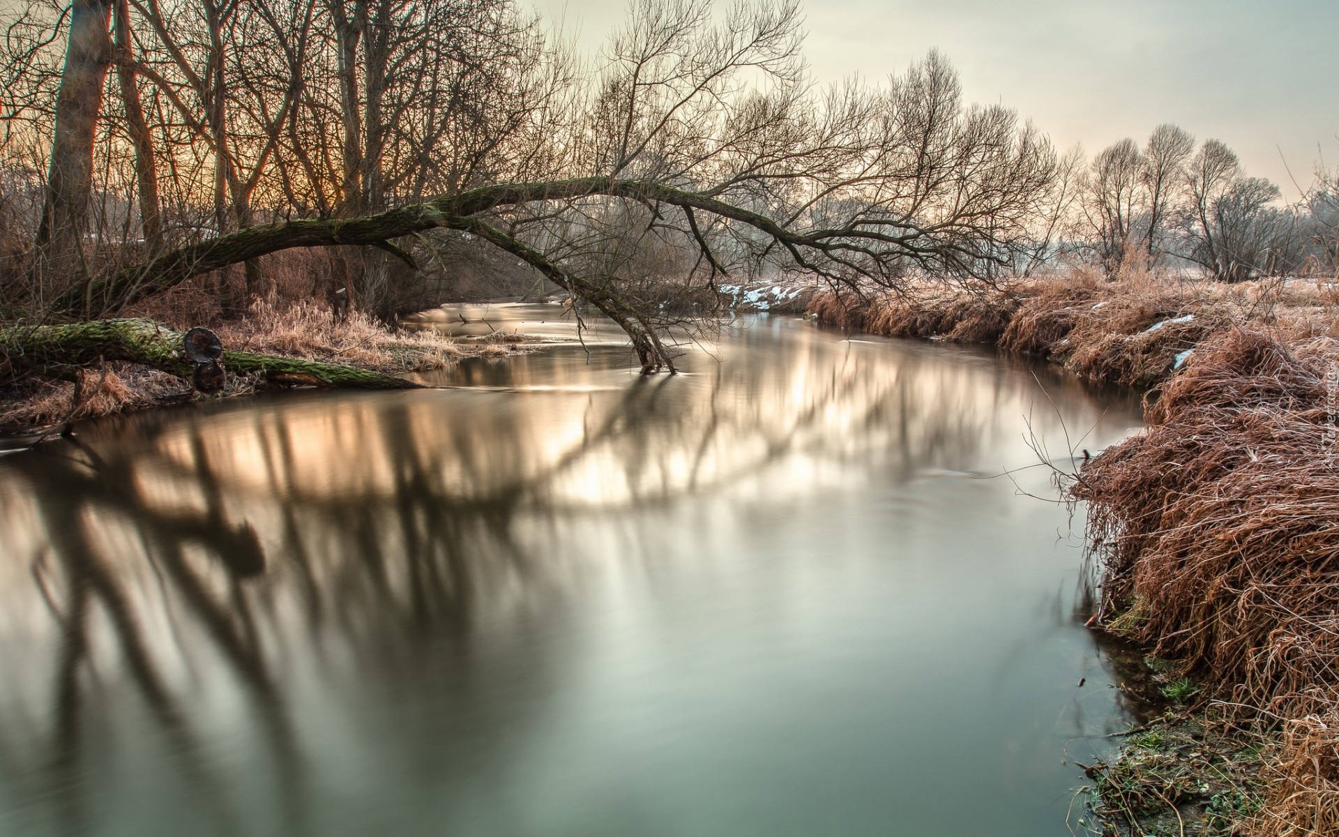 Edytor tapety: Rzeka, Drzewa, Trawy, Zima