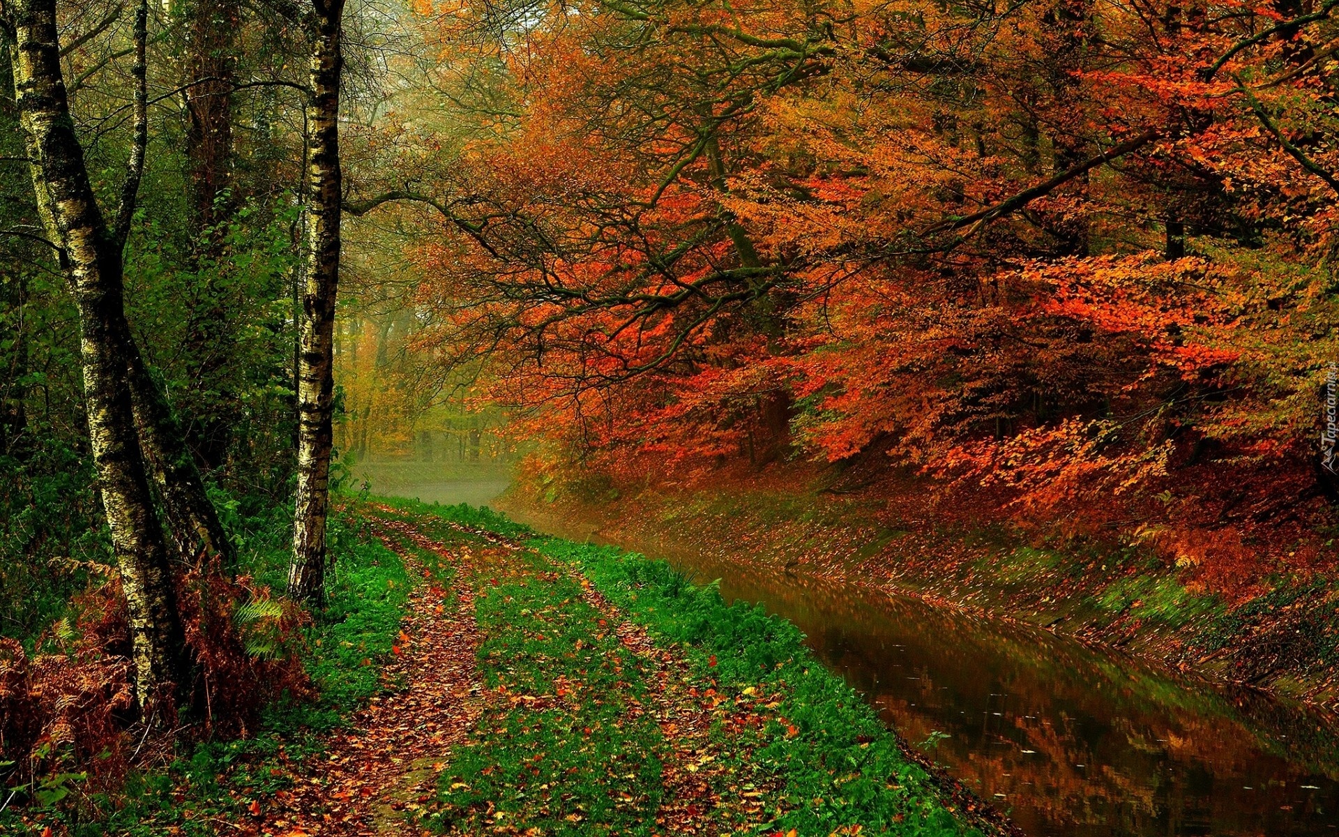 Edytor tapety: Rzeka, Las, Brzozy, Liście, Mgła, Jesień