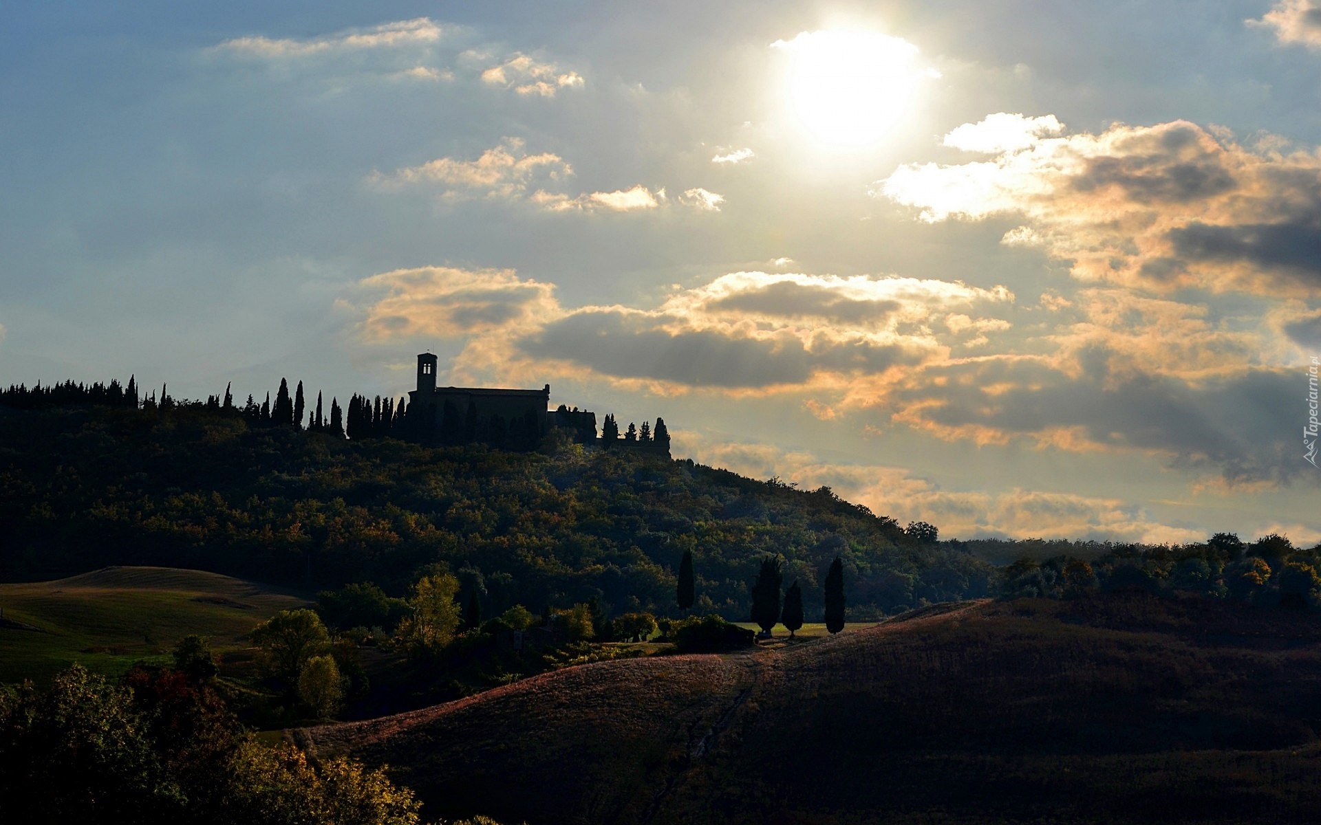 Edytor tapety: Włochy, Toskania, Dom, Drzewa, Chmury, Słońce, Poranek