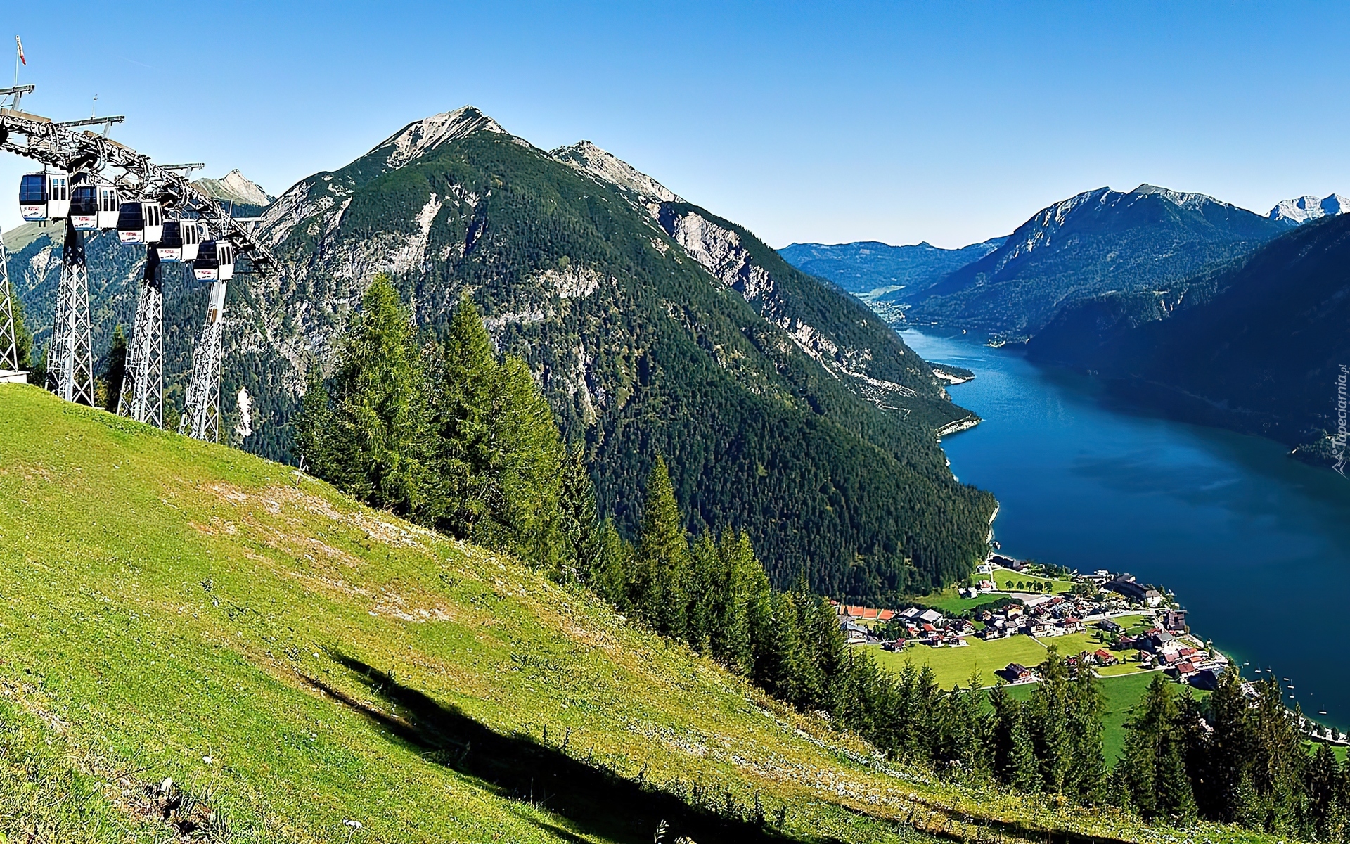 Edytor tapety: Tyrol, Góry, Lasy, Jezioro, Achensee, Wioska, Kolejka, Górska