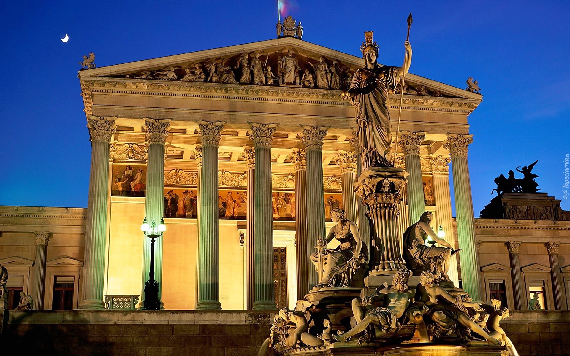 Edytor tapety: Wiedeń, Oświetlony, Gmach, Parlamentu, Fontanna