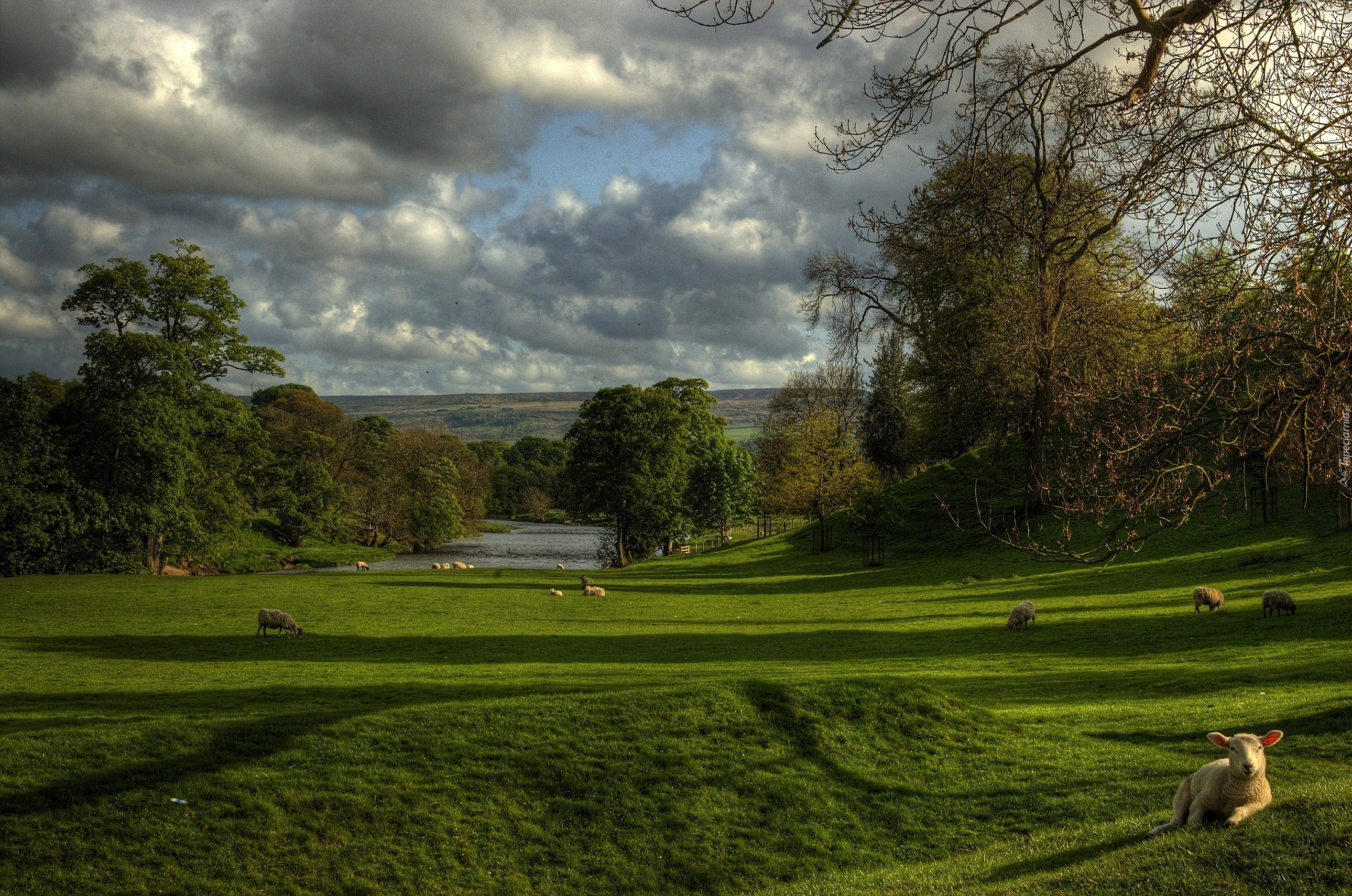 Edytor tapety: Owce, Łąka, Drzewa, Rzeczka, Chmury
