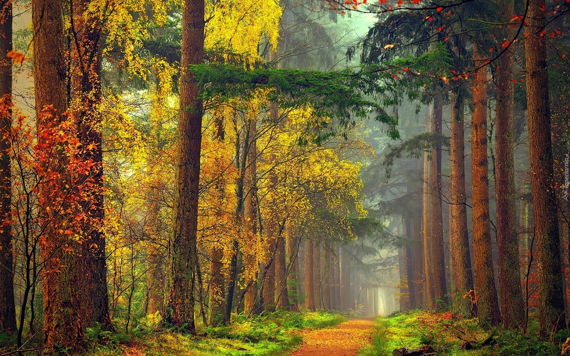 Edytor tapety: Las, Droga, Mgła, Przebijające, Światło, Jesień