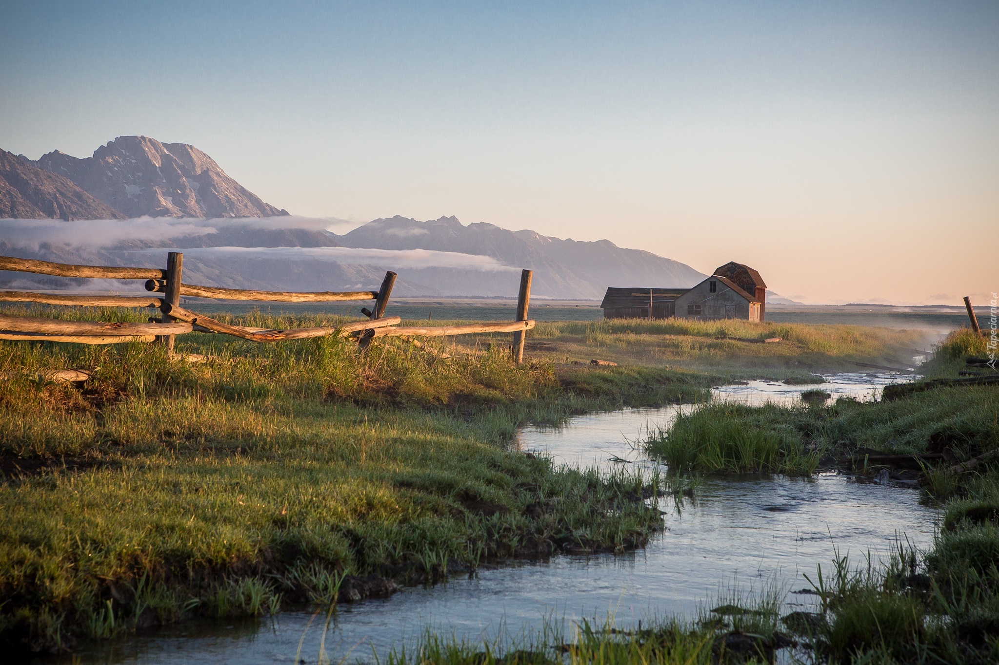 Edytor tapety: Rzeka, Łąki, Góry, Domek