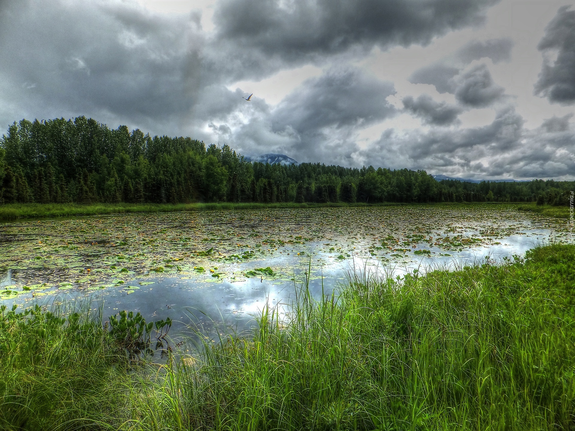 Edytor tapety: Jezioro, Trawy, Drzewa