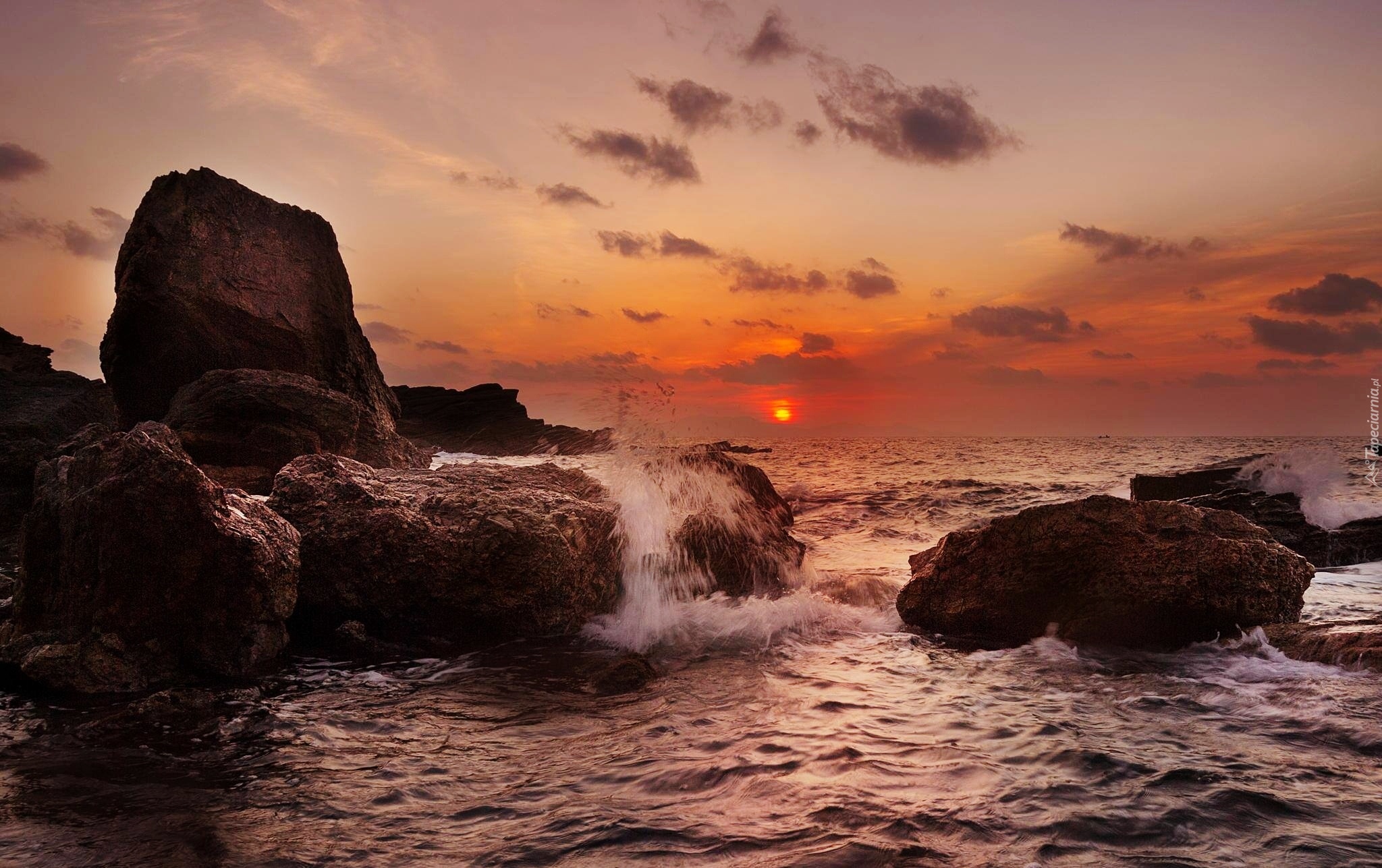 Edytor tapety: Zachód, Słońca, Skały, Morze