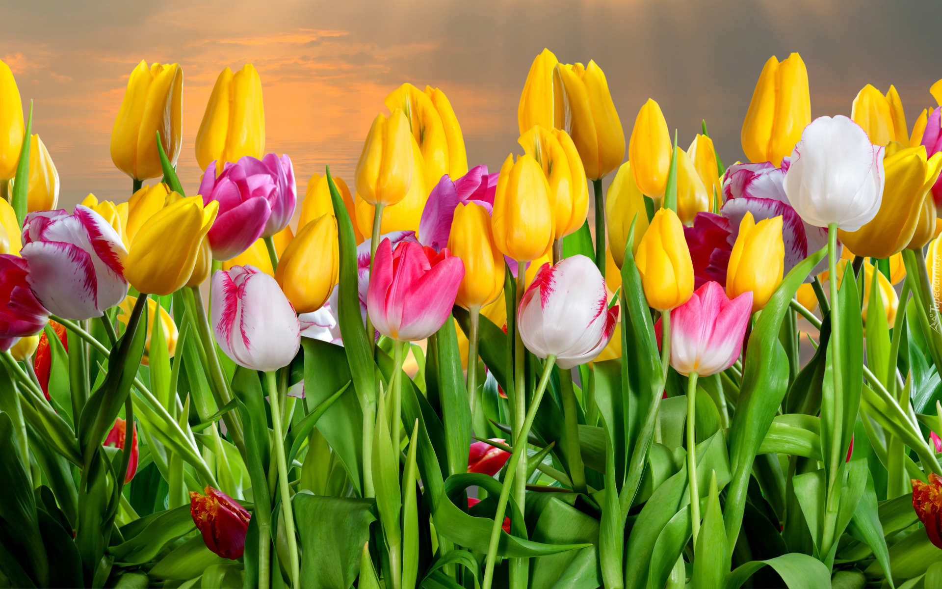 Edytor tapety: Tulipany, Niebo, Promienie, Słońca