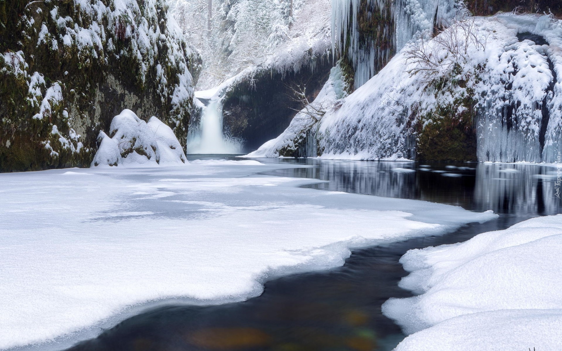 Edytor tapety: Wodospad, Skały, Las, Rzeka, Zima