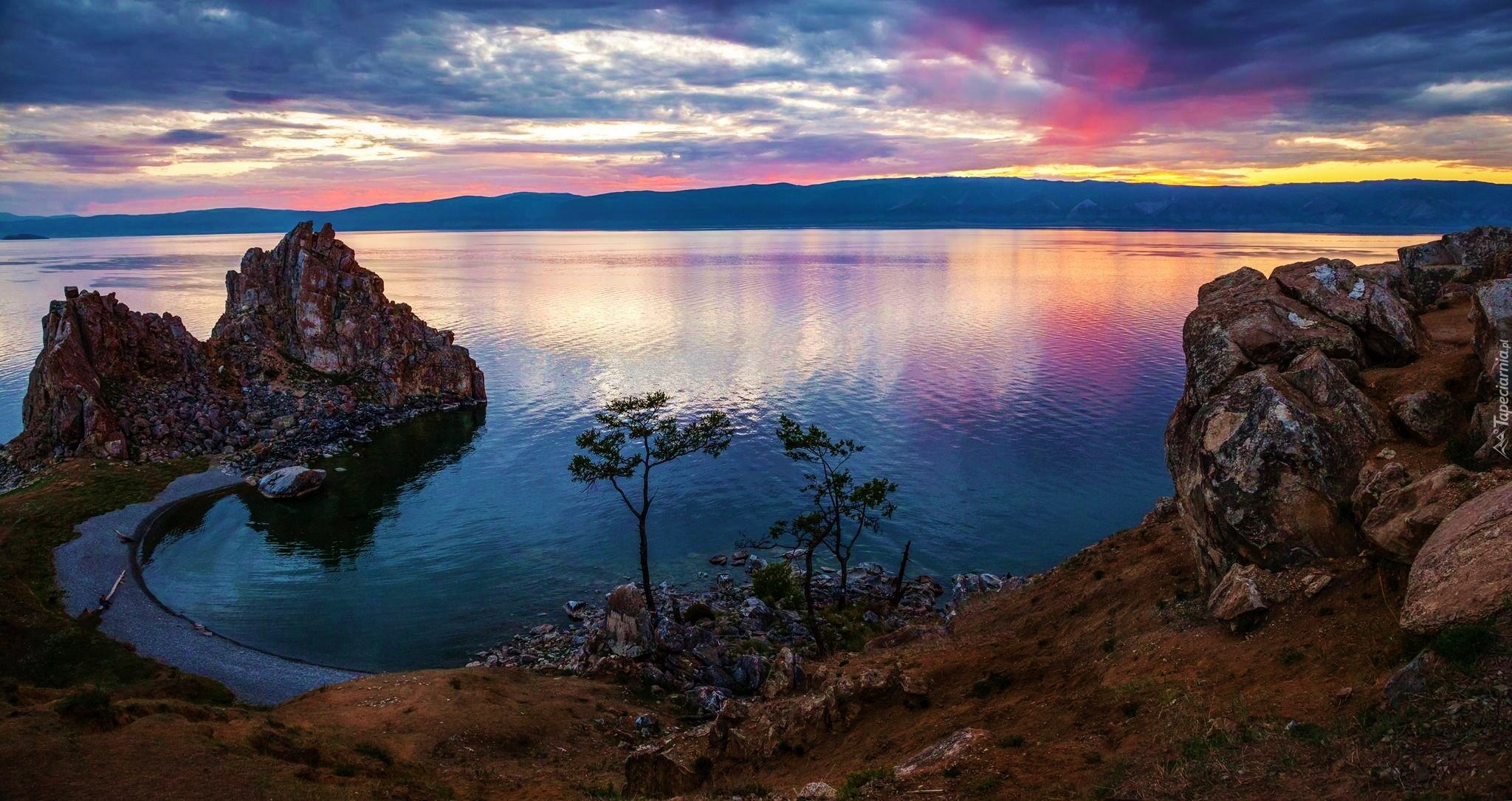 Edytor tapety: Zachód, Słońca, Jezioro, Skały