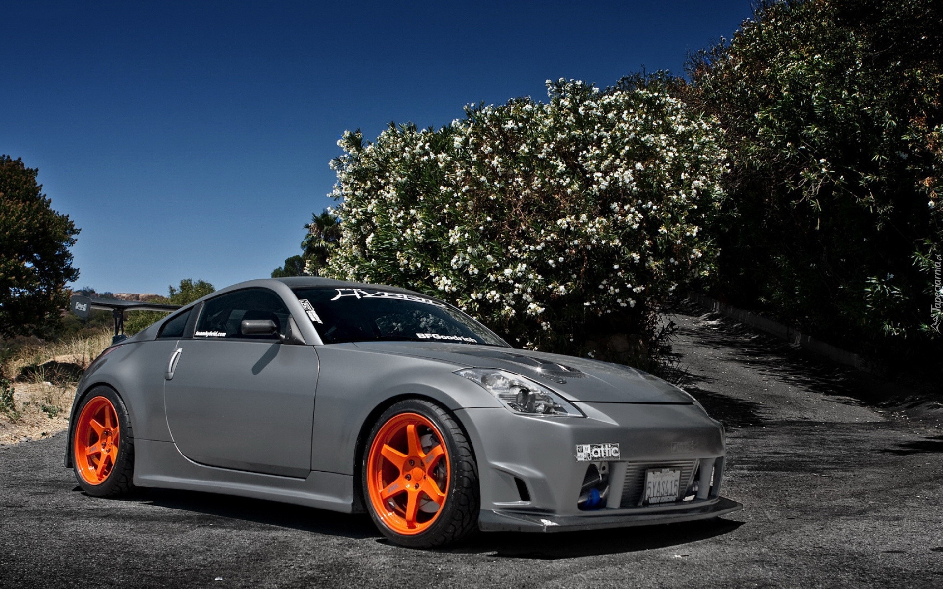 Edytor tapety: Samochód, Nissan, 350Z, Kwitnące, Drzewa