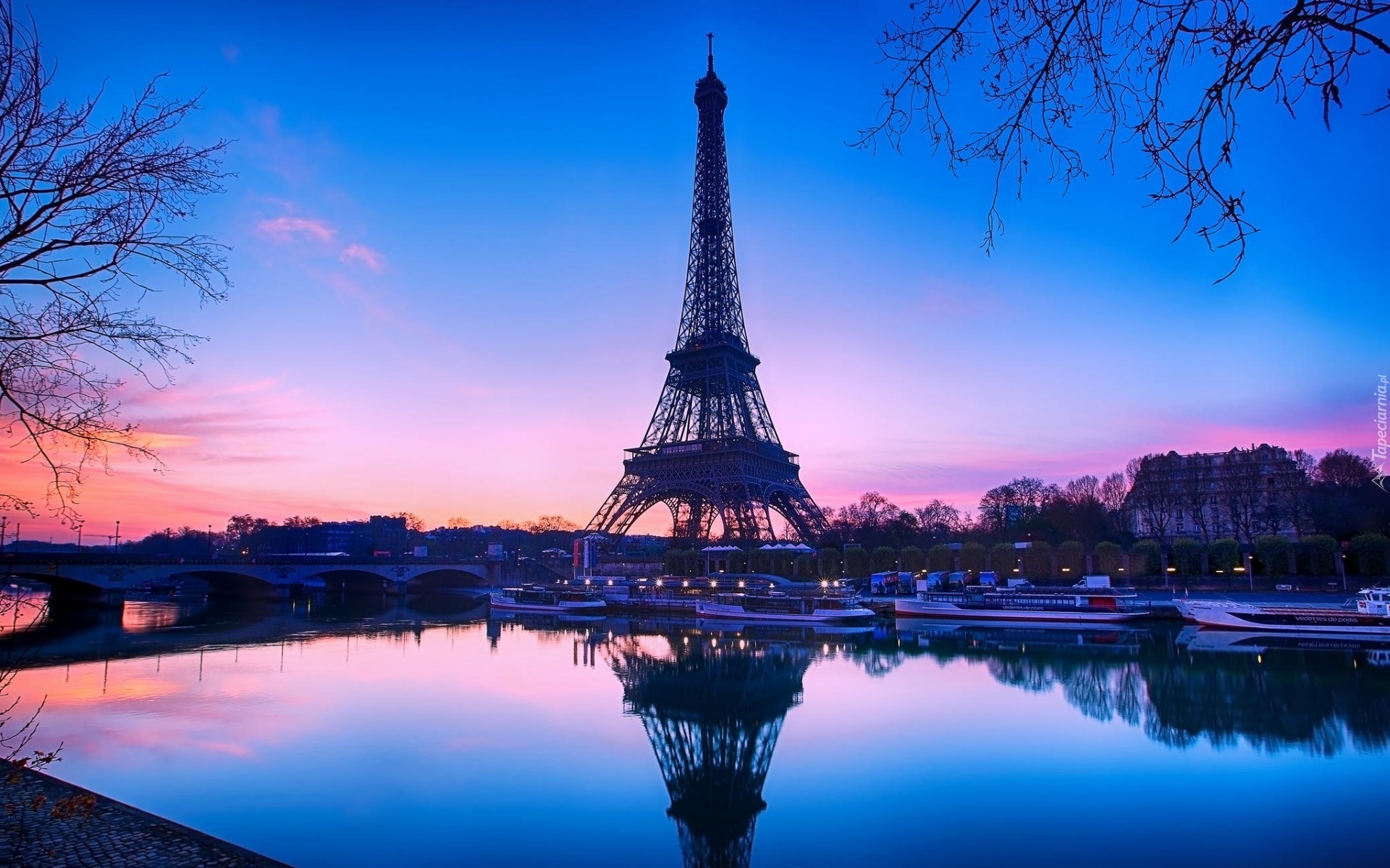 Edytor tapety: Wieża, Eiffla, Rzeka, Most, Statki, Wschód, Słońca, Paryż