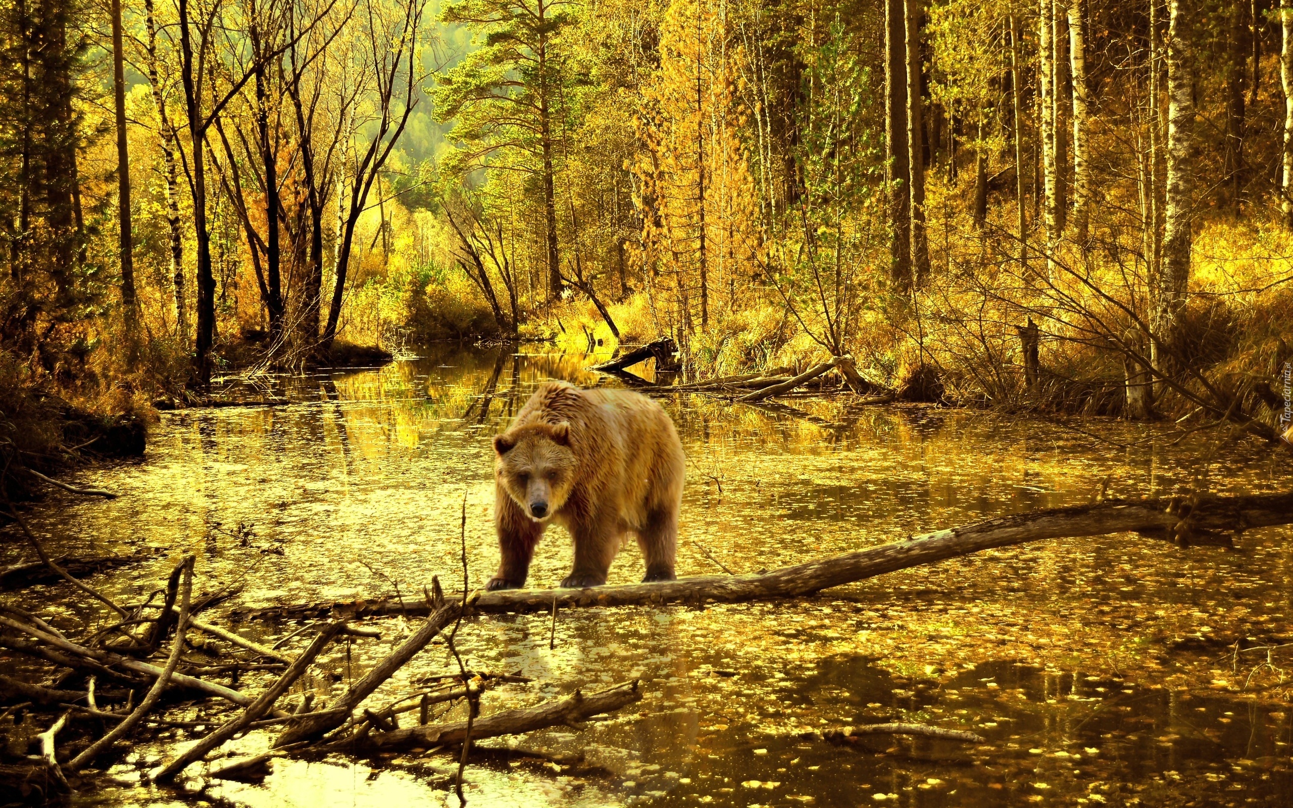Edytor tapety: Niedzwiedz, Brunatny, Rzeka, Las, Światło, Jesień