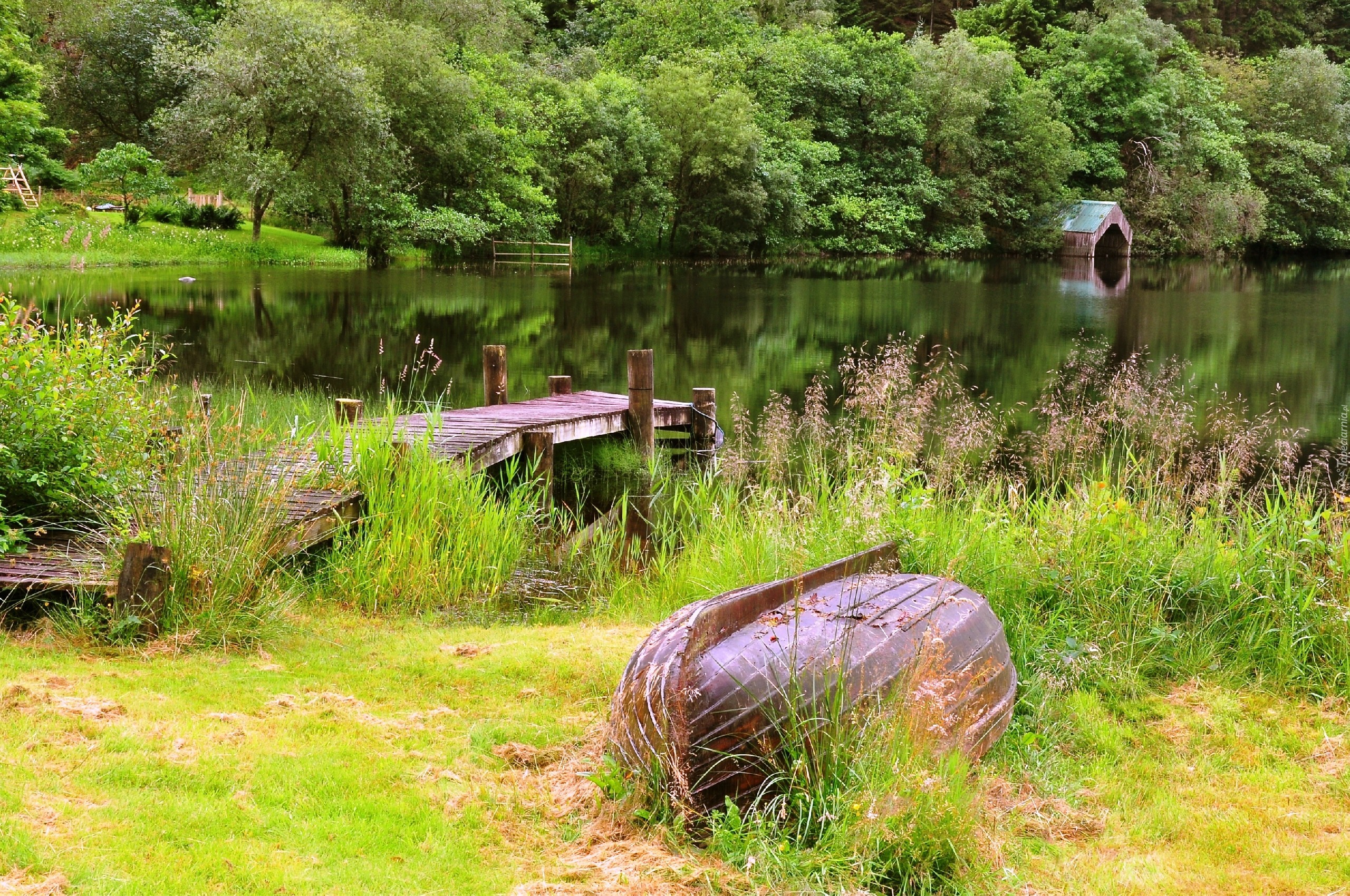 Edytor tapety: Łódka, Pomost, Jezioro, Las