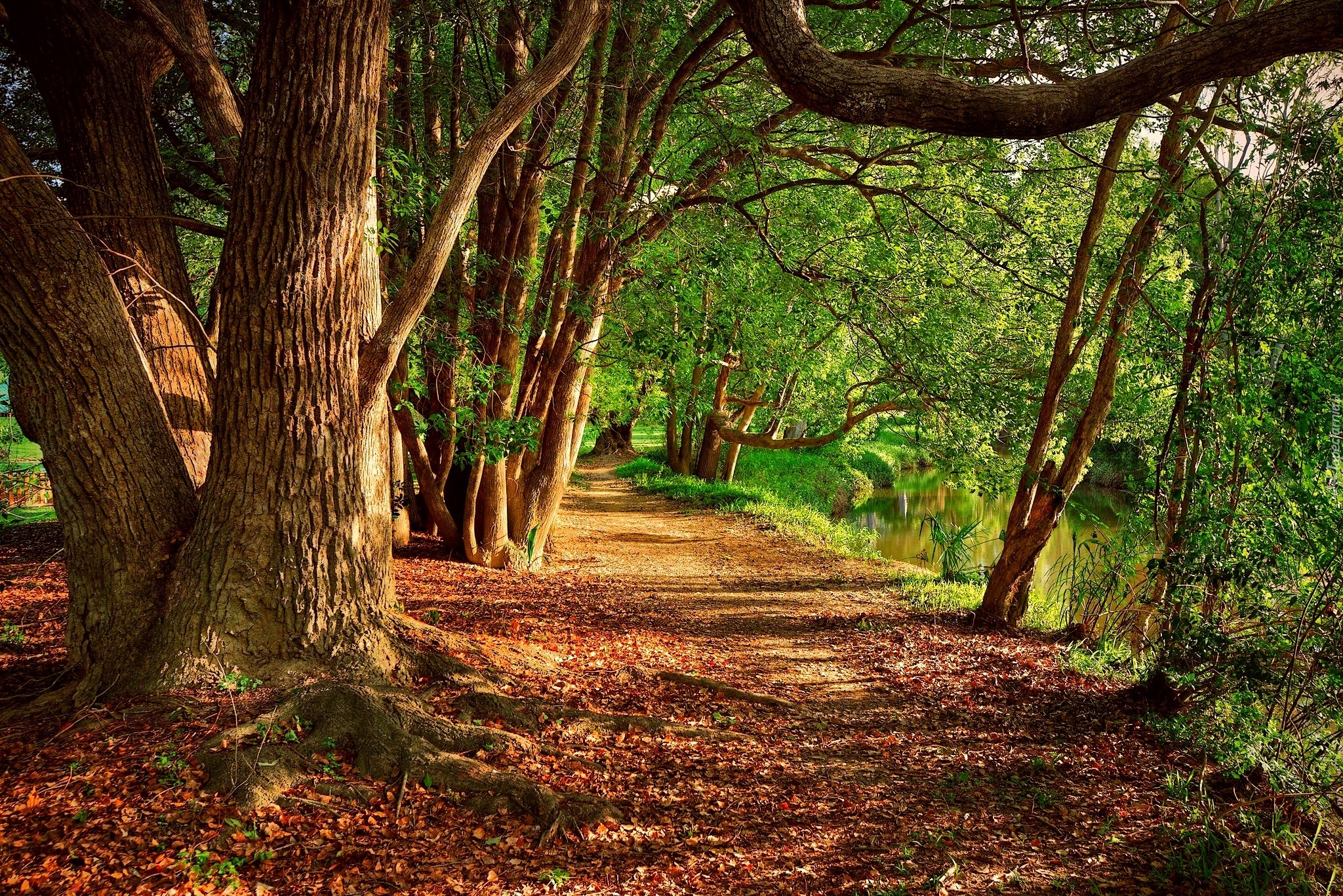Edytor tapety: Droga, Drzewa, Rzeczka