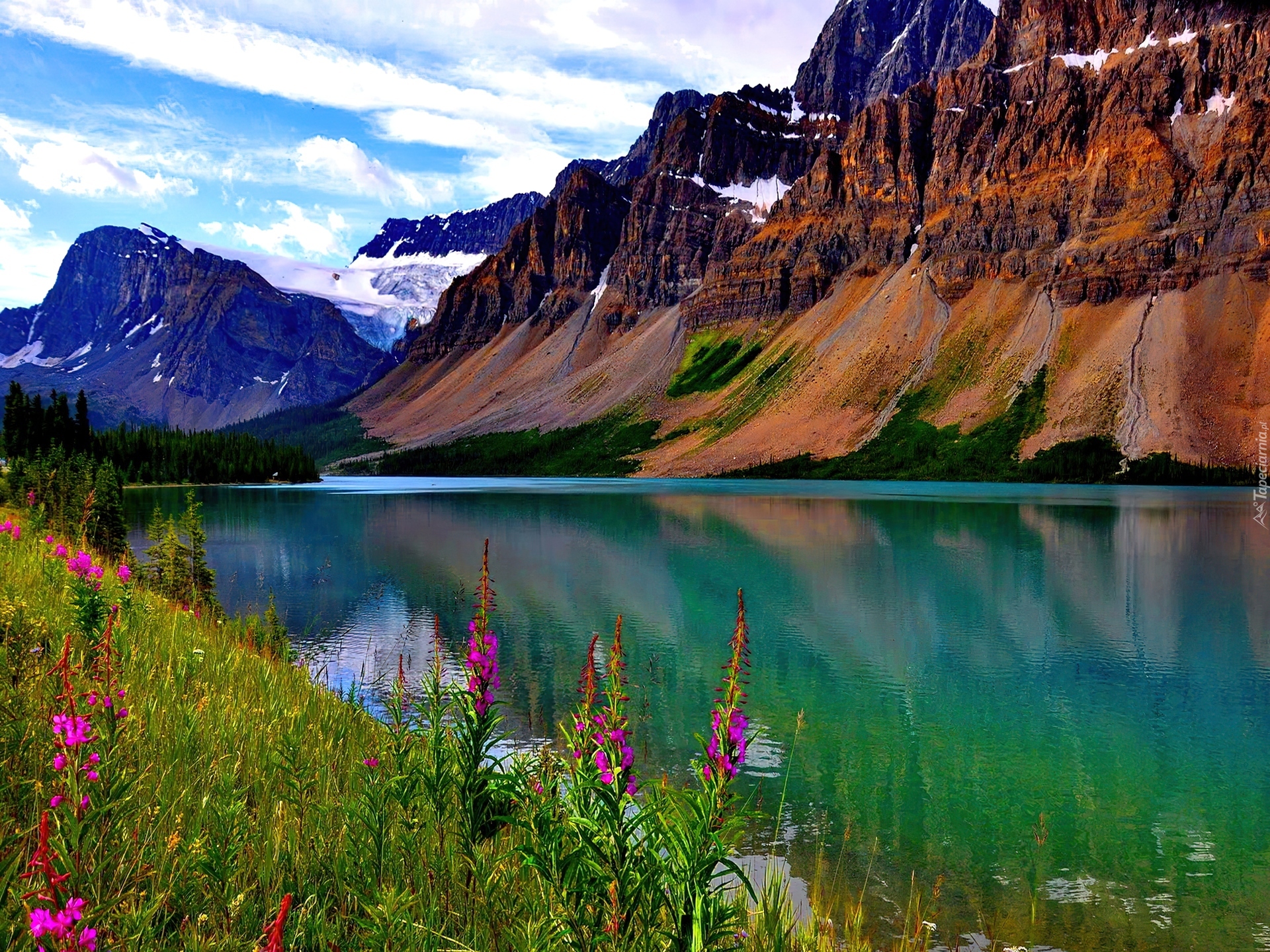 Edytor tapety: Jezioro, Góry, Kwiaty