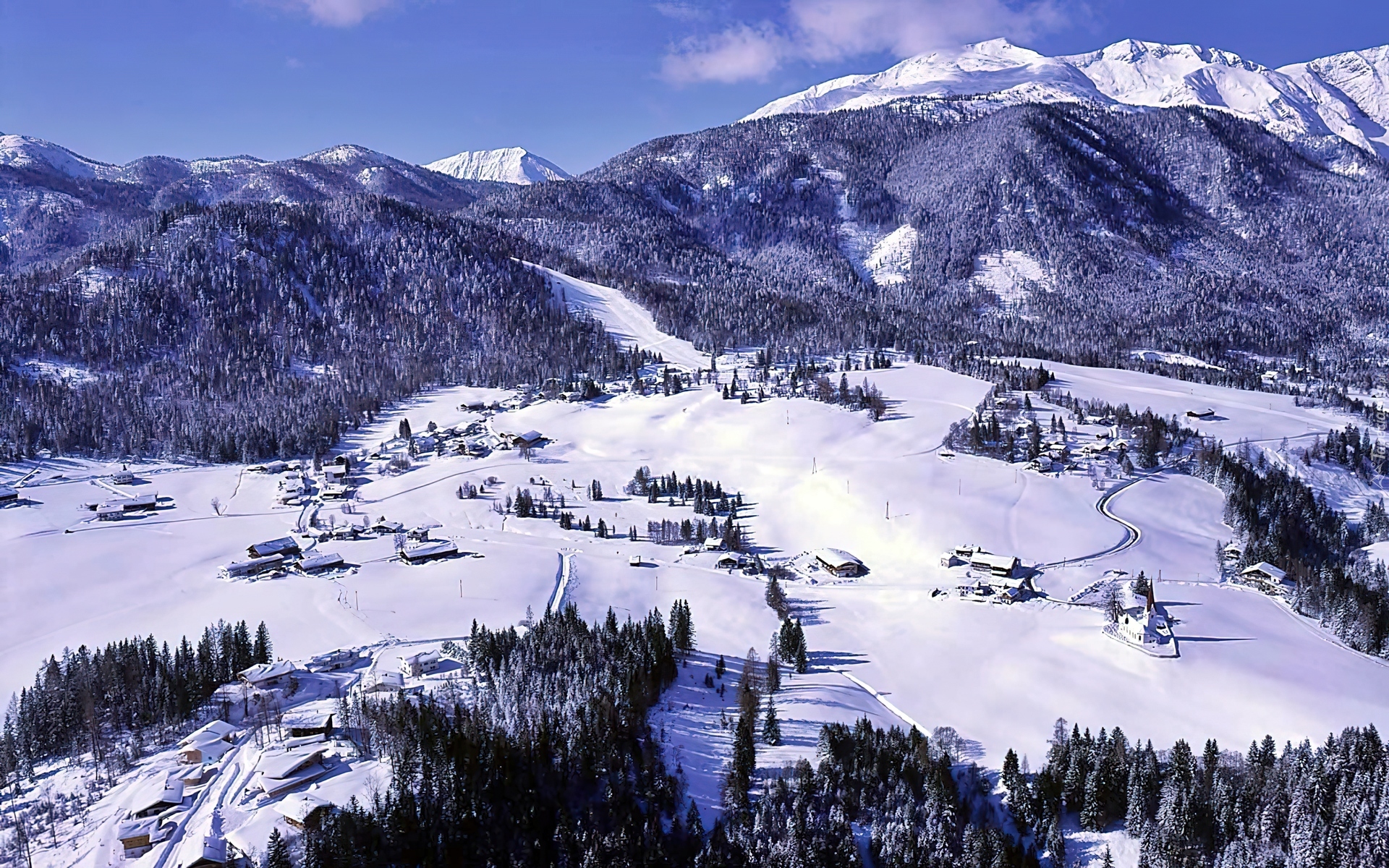 Edytor tapety: Zima, Alpy, Lasy, Dolina, Wioska