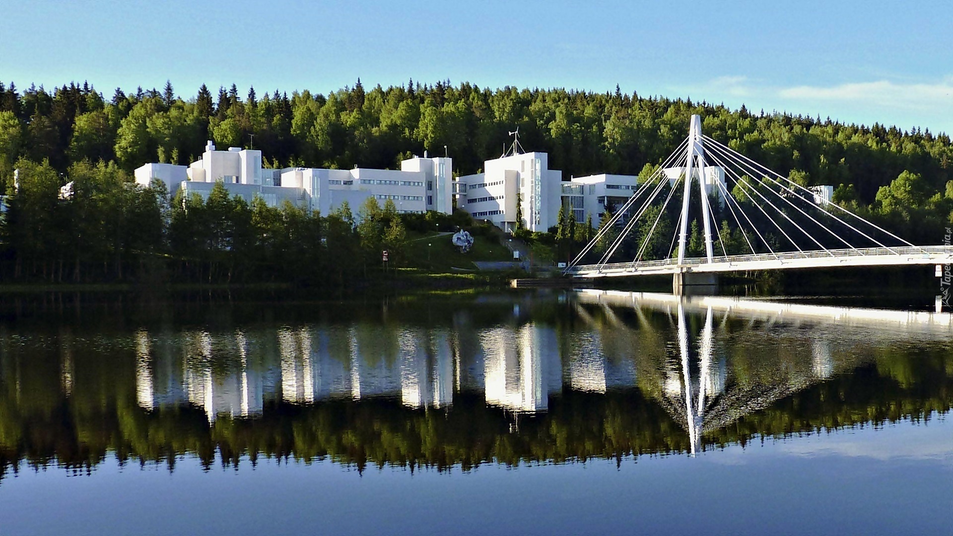 Edytor tapety: Rzeka, Vantaa, Most, Budynki, Las, Przebijające, Światło