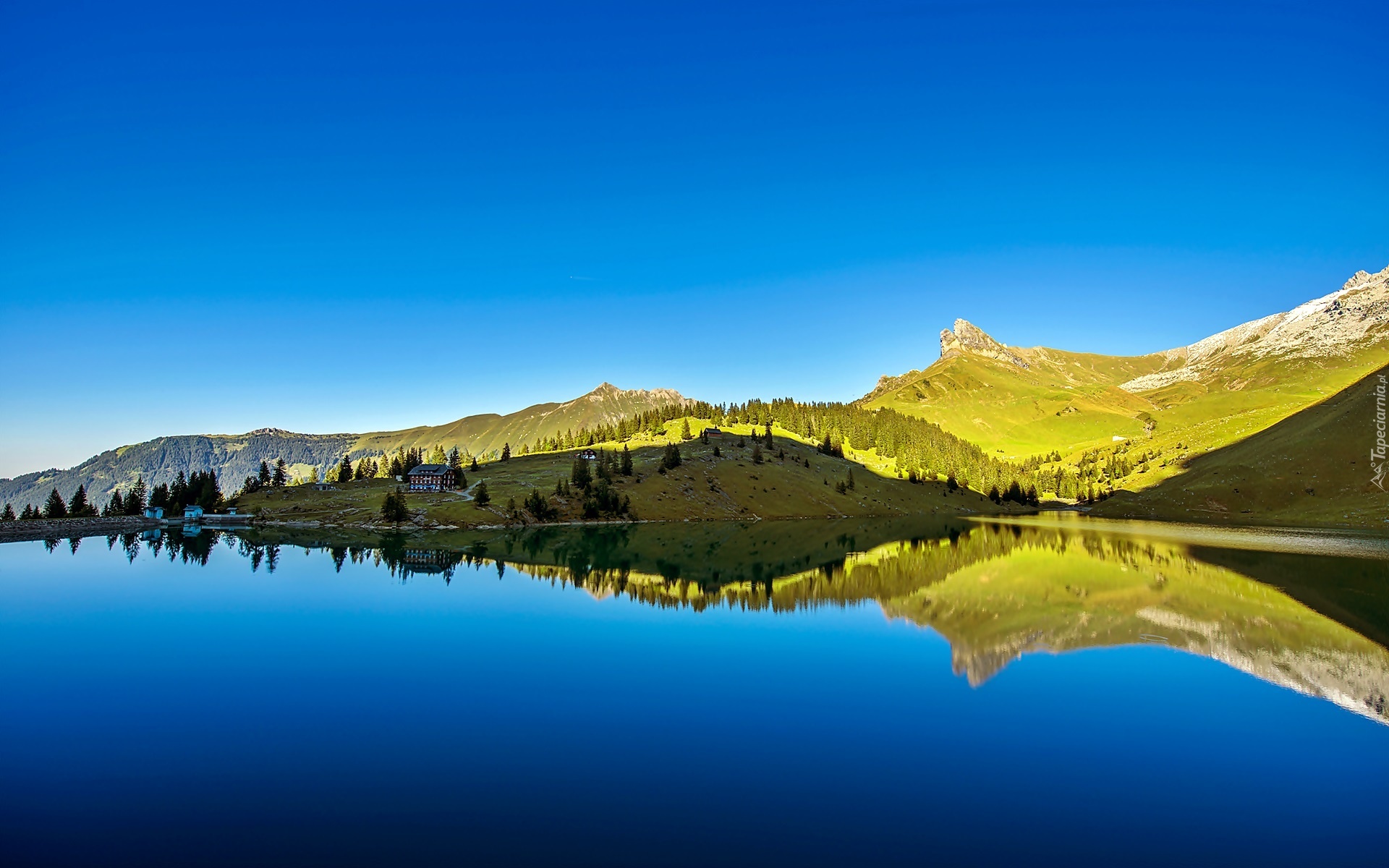 Edytor tapety: Góry, Lasy, Łąki, Domy, Odbicie, Przebijające, Śiwiatło