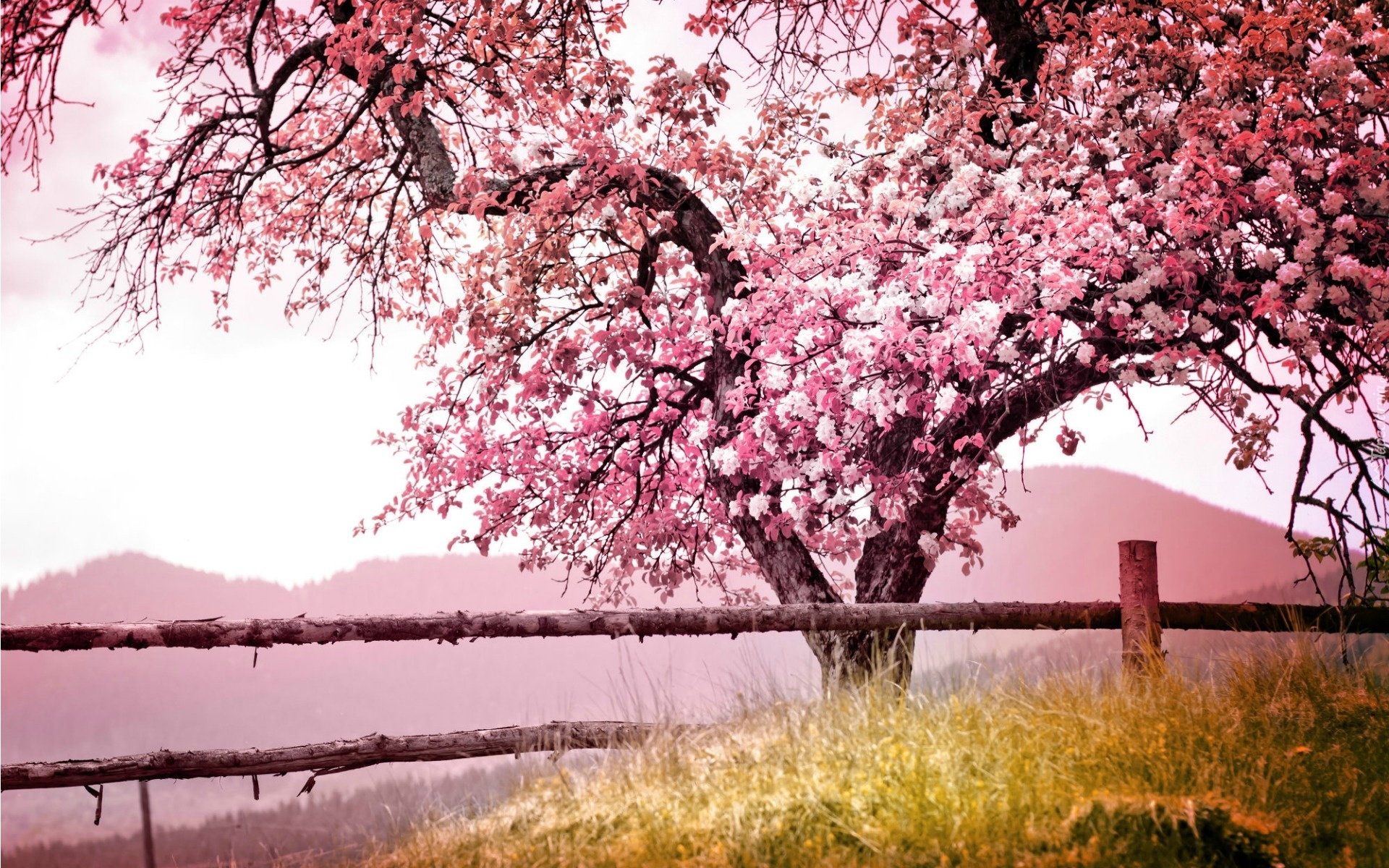 Edytor tapety: Kwitnące, Drzewo, Ogrodzenie, Góry, Łąka, Poranek