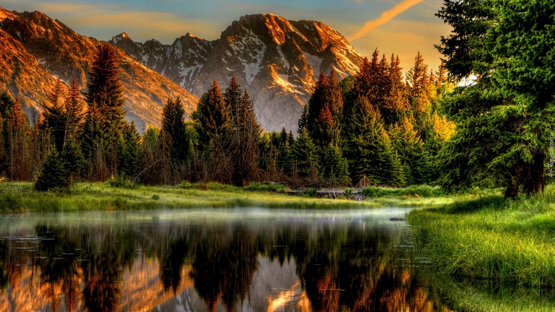 Edytor tapety: Góry, Las, Jezioro, Zachód, Słońca