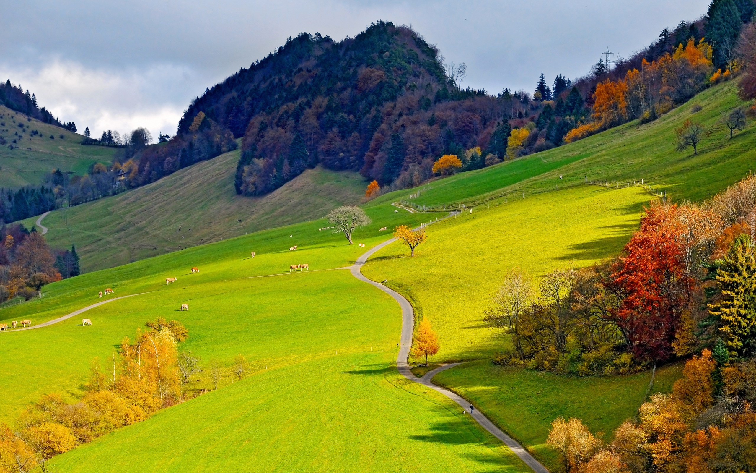 Edytor tapety: Łąki, Krowy, Droga, Lasy, Góry, Światło