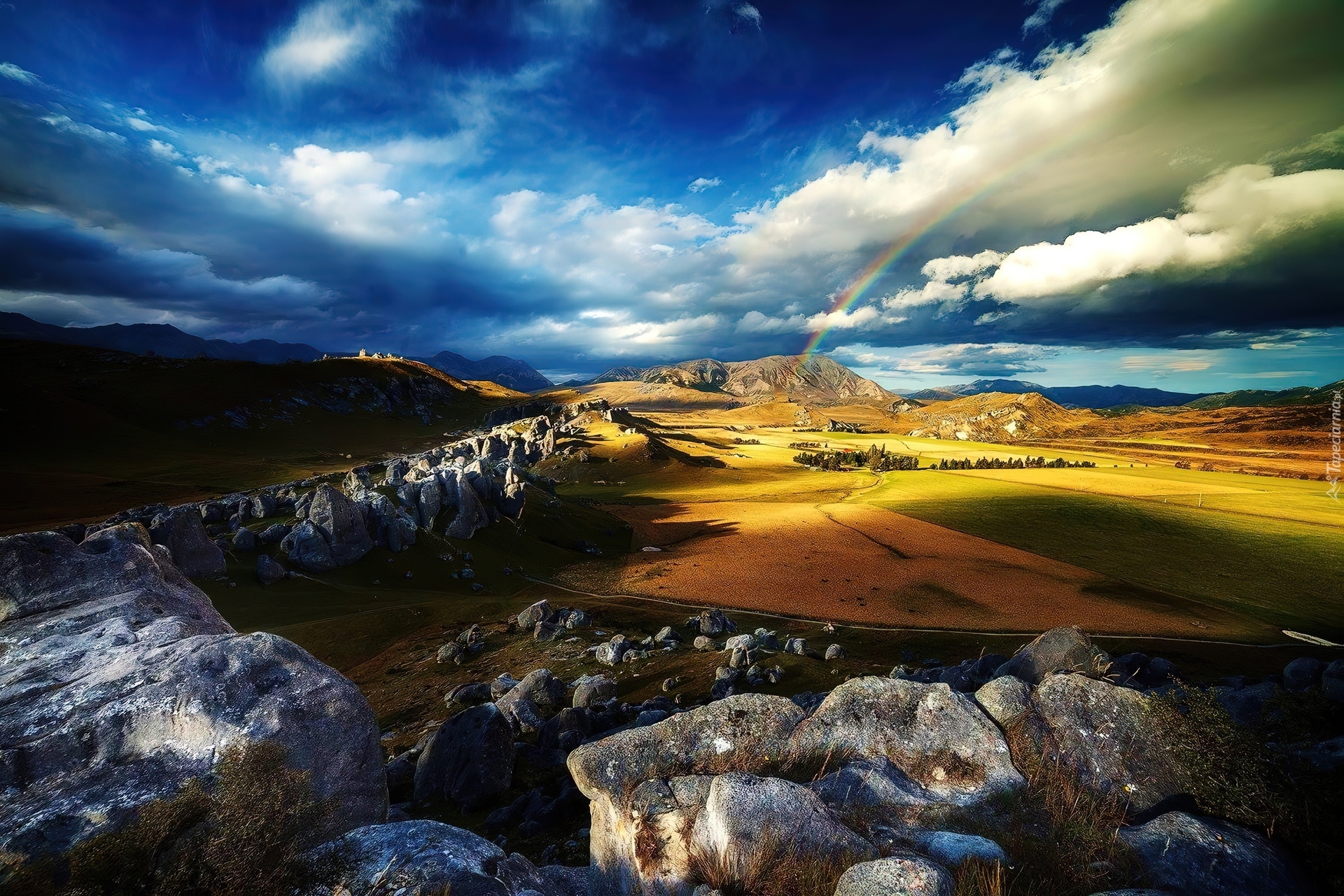 Edytor tapety: Tęcza, Niebo, Kamienie, Pola, Przebijające, Światło