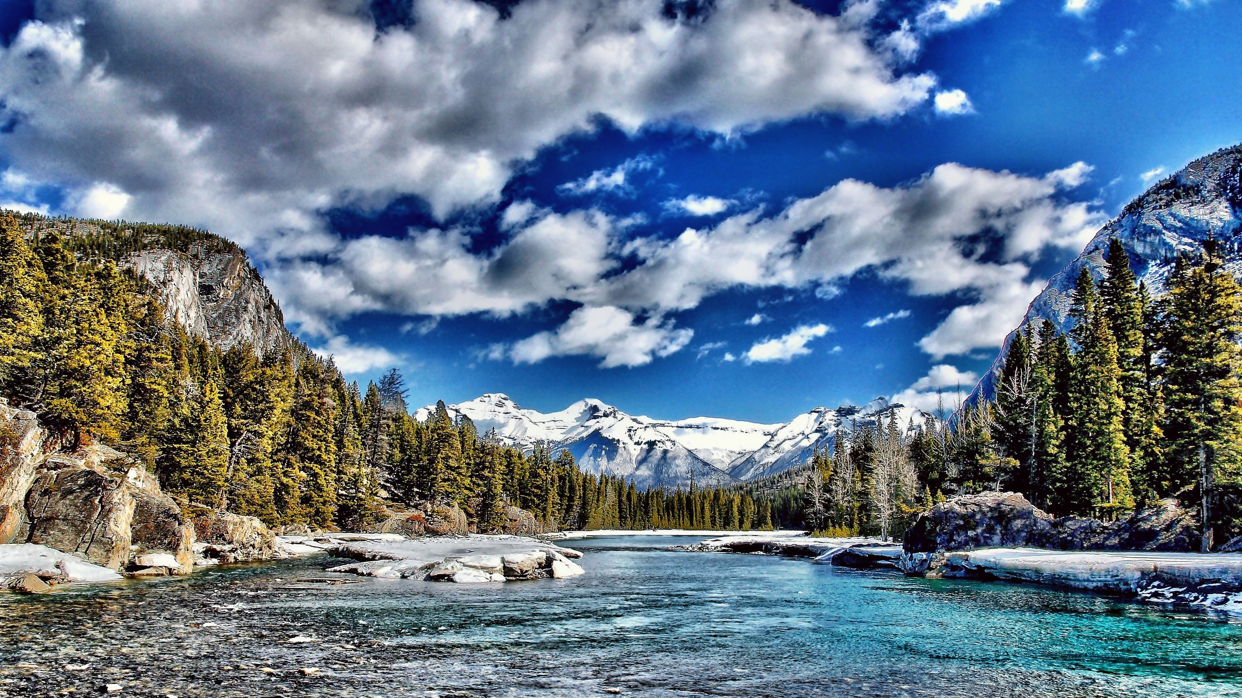 Edytor tapety: Rzeka, Lasy, Góry, Niebo, Obłoki