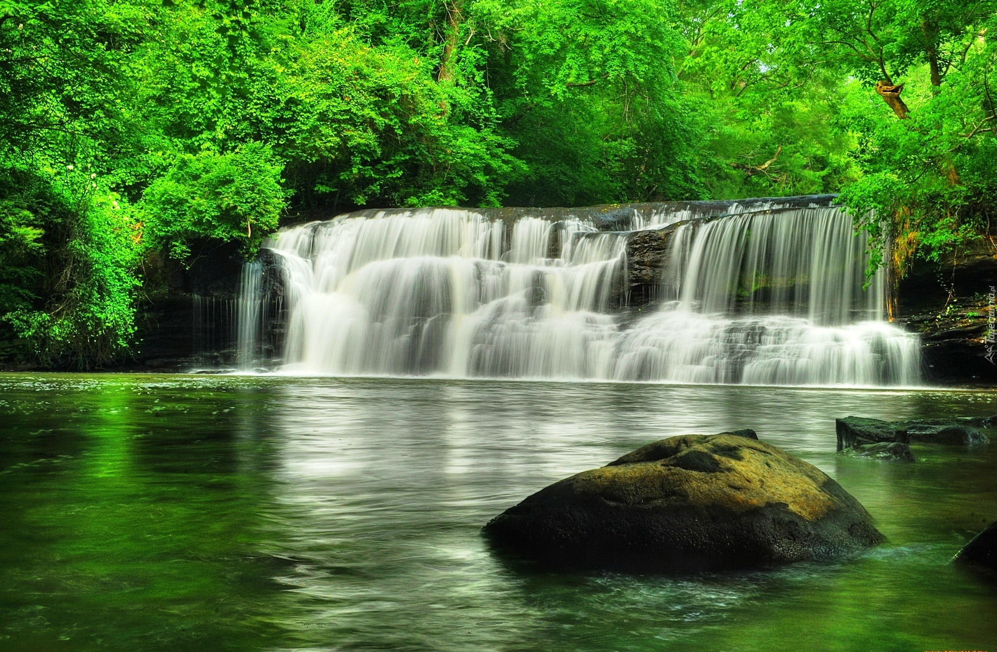 Edytor tapety: Wodospad, Jezioro, Las, Skały