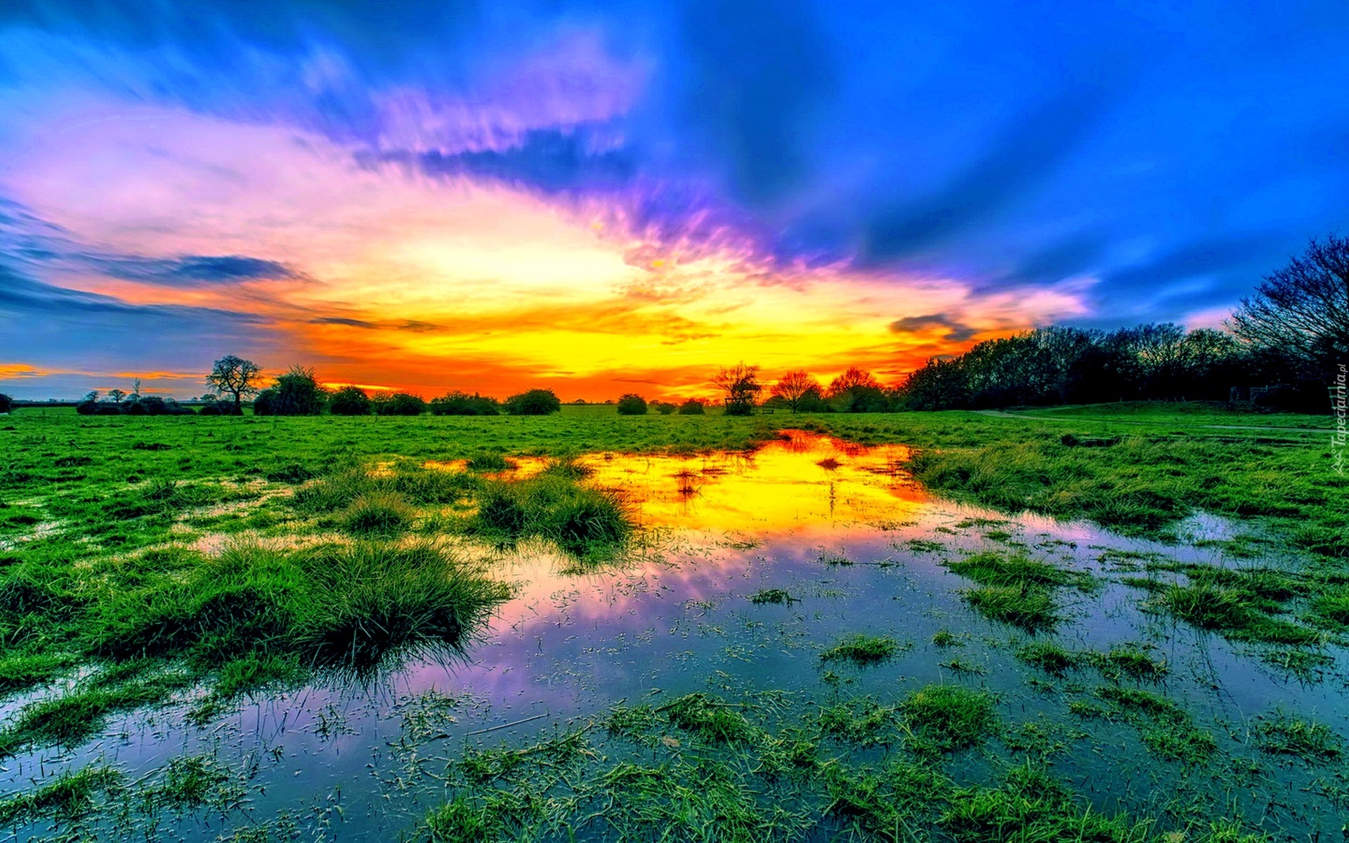 Edytor tapety: Łąka, Bagno, Chmury, Zachód Słońca, Drzewa