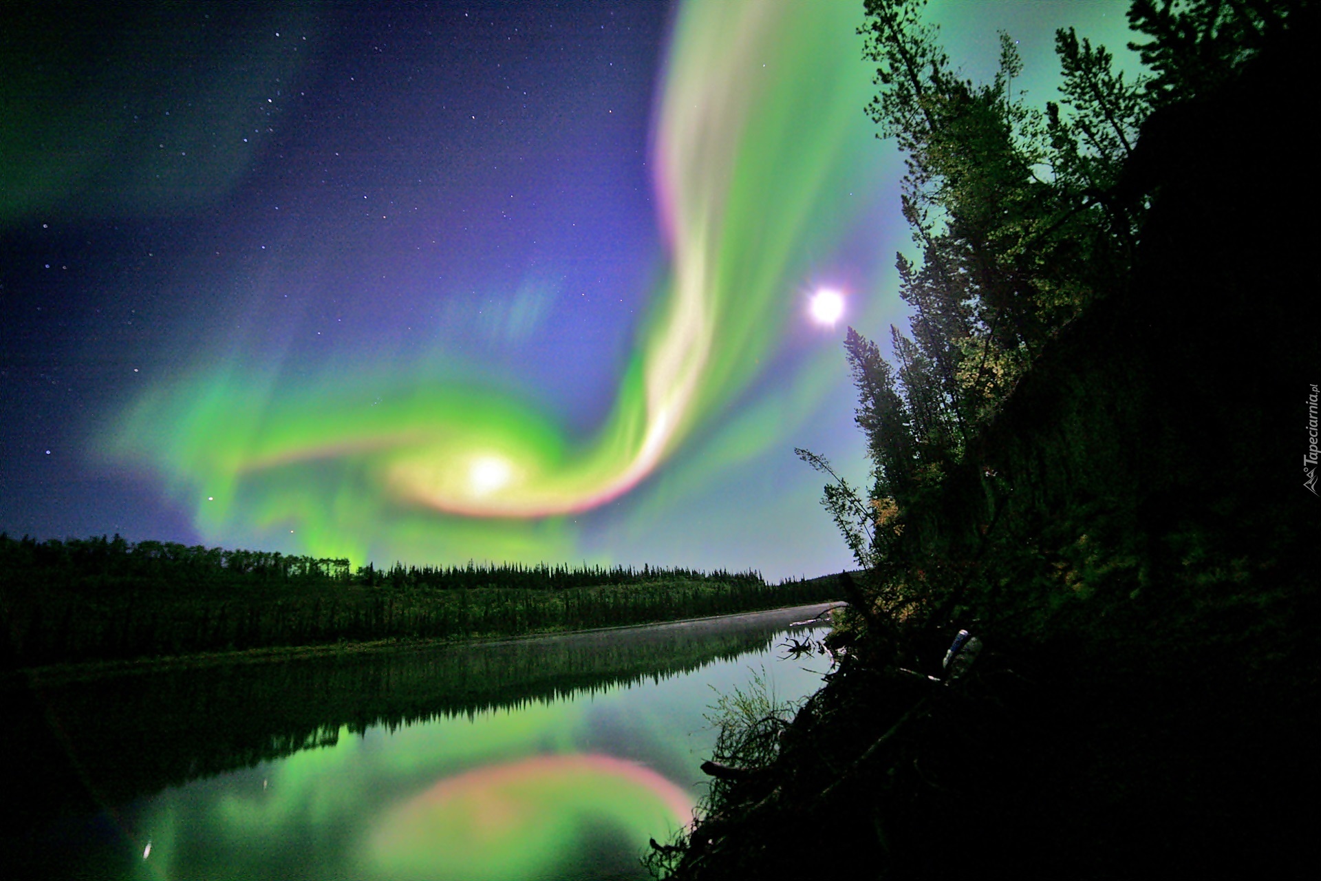 Edytor tapety: Zorza, Polarna, Promienie, Słońca, Rzeka, Las