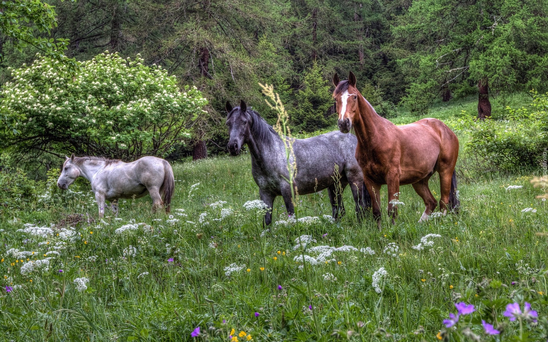 Edytor tapety: Konie, Łąka, Kwiaty, Las, HDR