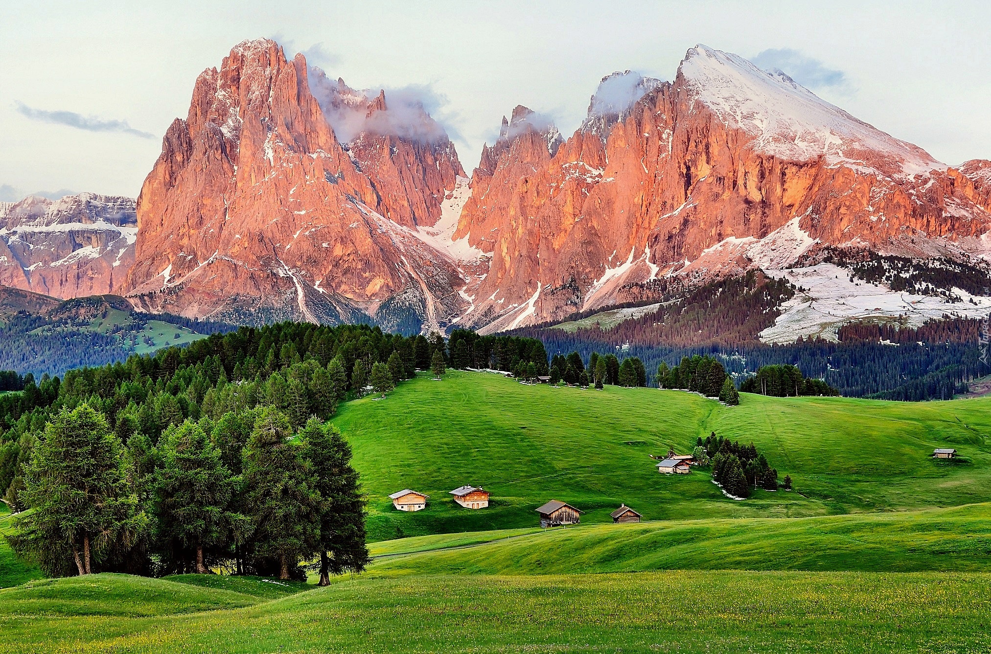 Edytor tapety: Enrosadira, Włochy, Góry, Las, Domy, Lato