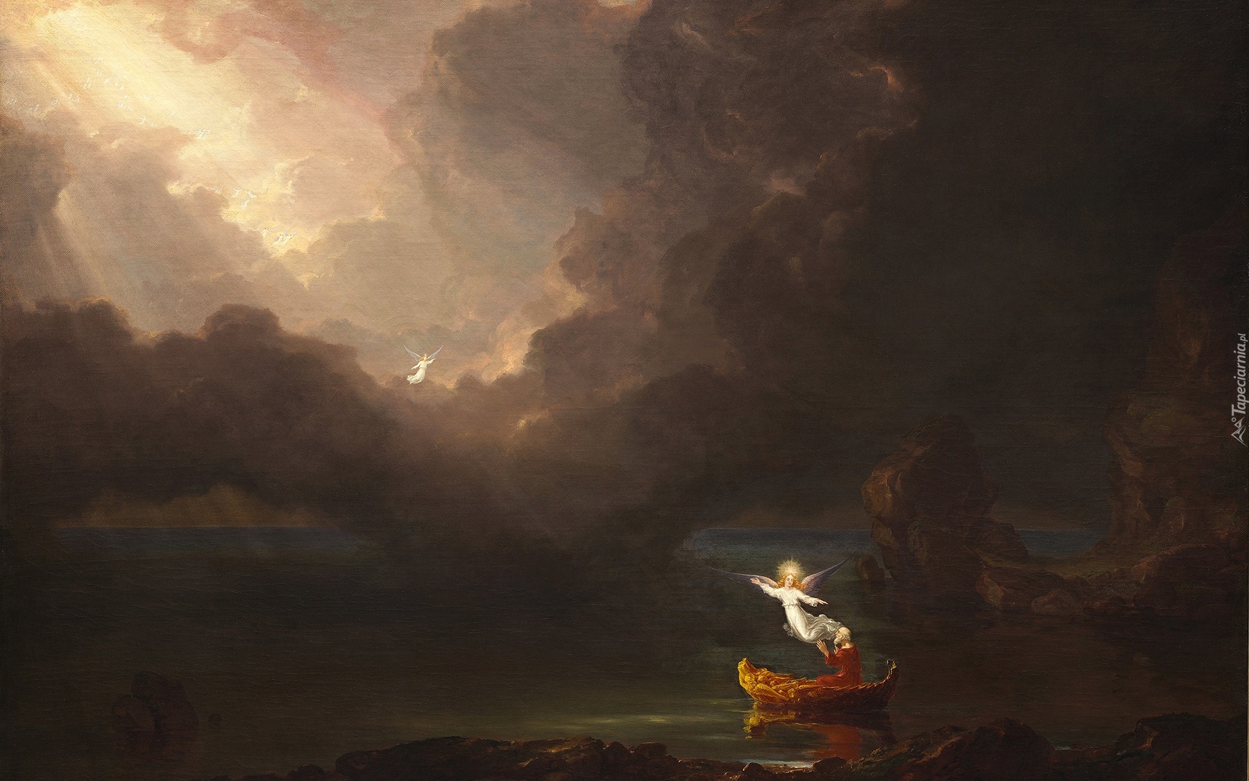 Edytor tapety: Malarstwo, Obraz, Niebo, Chmury, Łódka, Starzec, Anioły