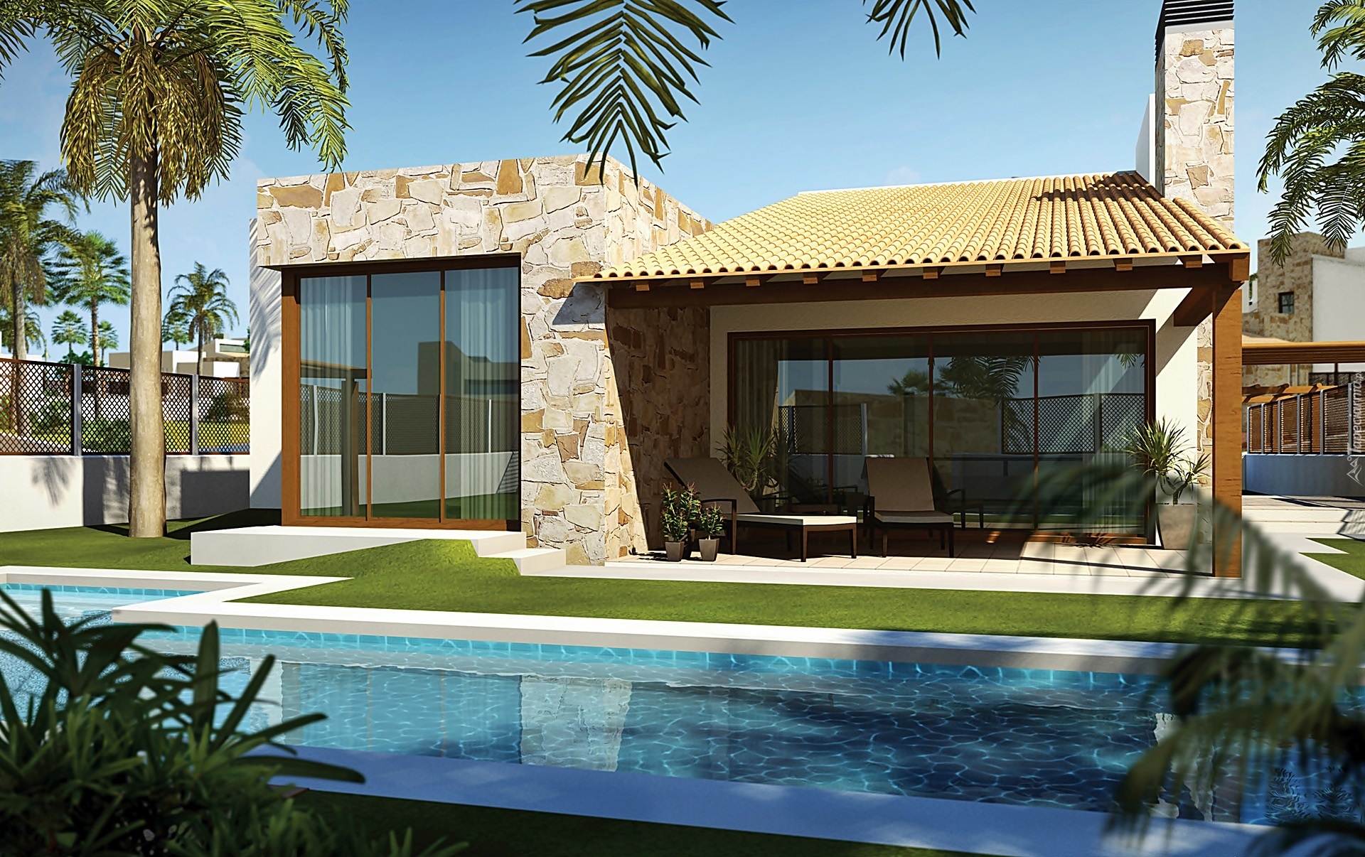 Edytor tapety: Dom, Basen, Palmy, Przebijające, Światło