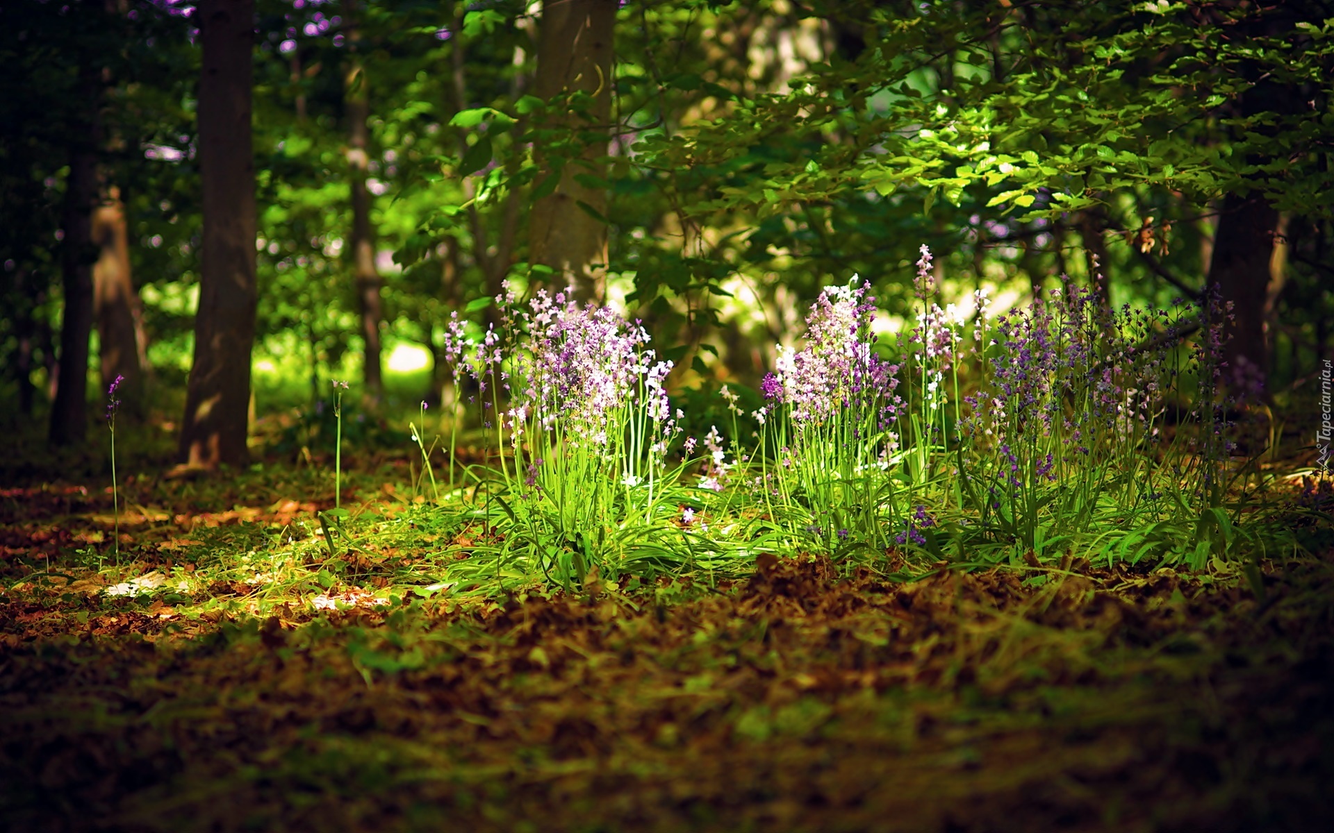 Edytor tapety: Wiosna, Las, Polana, Kwiaty, Przebijające, Światło