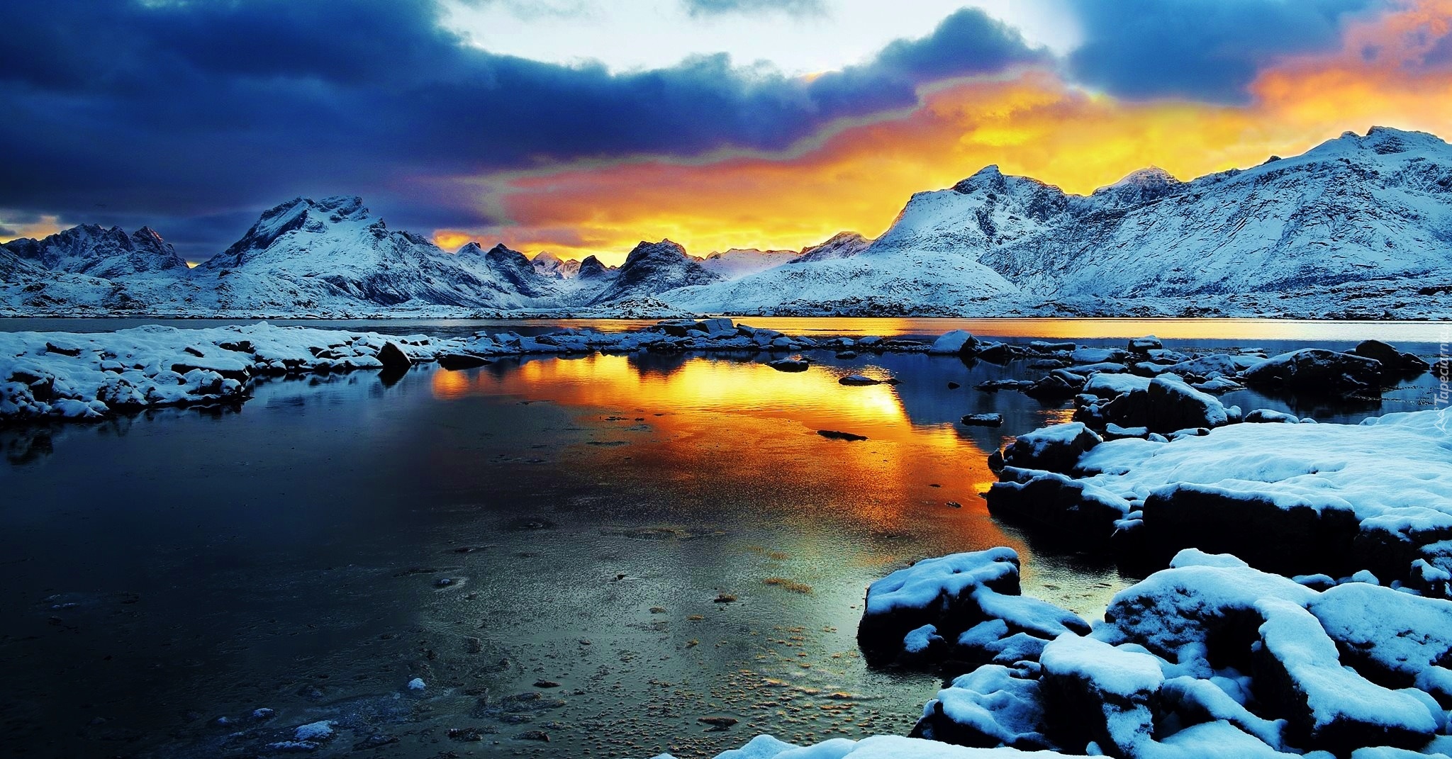Edytor tapety: Zachód, Słońca, Góry, Śnieg, Morze
