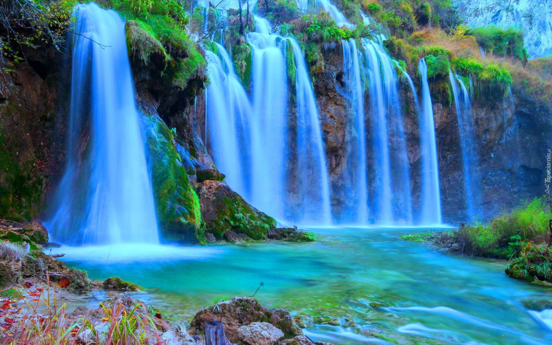 Edytor tapety: Wodospad, Skały, Góra, Kamienie, Trawy, Rośliny