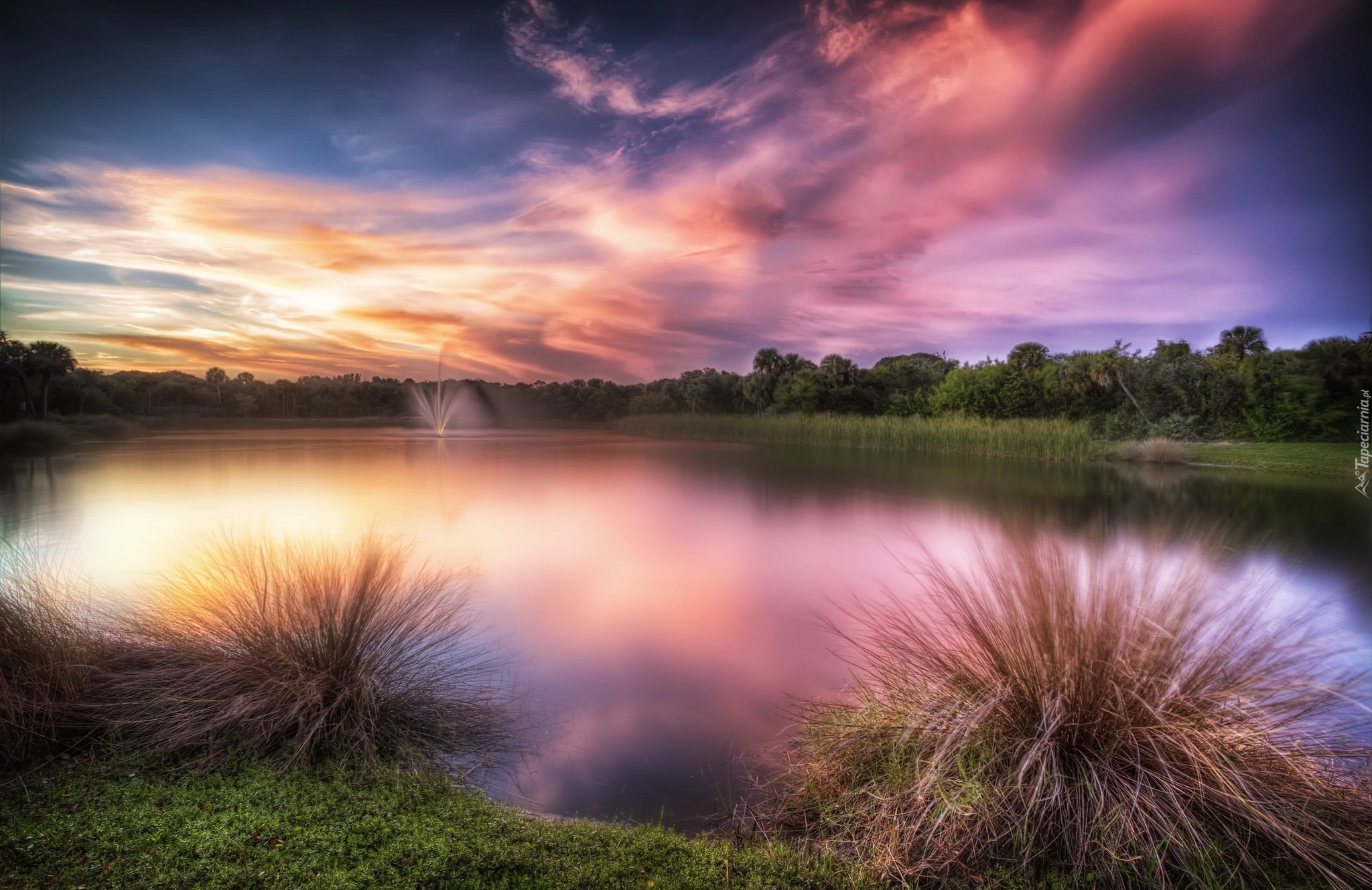Edytor tapety: Jeziorko, Fontanna, Trawy, Lasy, Chmury