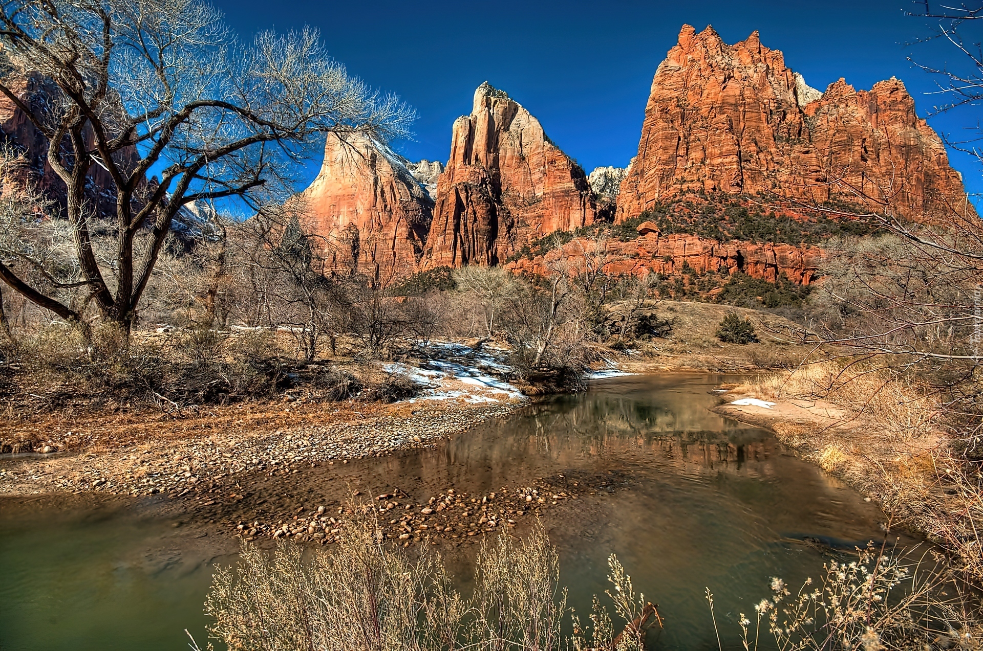 Edytor tapety: Stany Zjednoczone, Stan Utah, Park Narodowy Zion, Góry, Skały, Court of the Patriarchs, Rzeka Virgin River