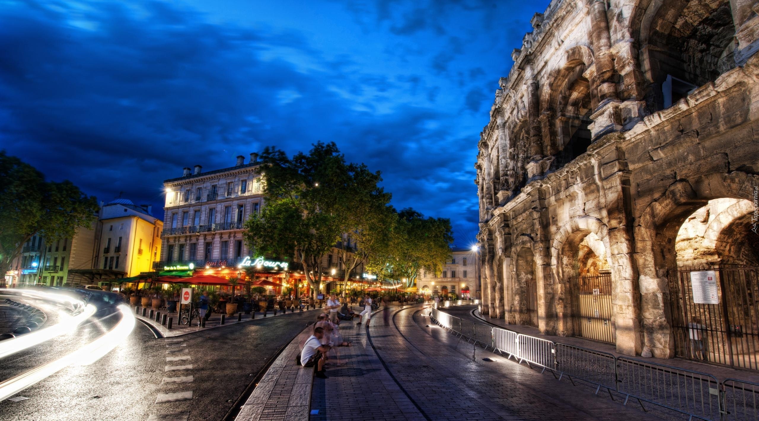 Edytor tapety: Francja, Nimes, Miasto, Domy, Ludzie, Noc