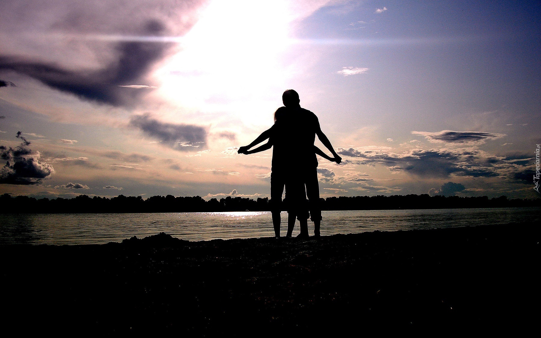 Edytor tapety: Zakochani, Postaci, Jezioro, Zachód, Słońca