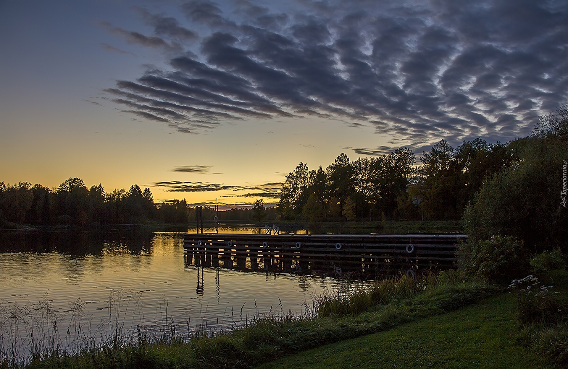 Edytor tapety: Zachód, Słońca, Rzeka, Pomost, Drzewa