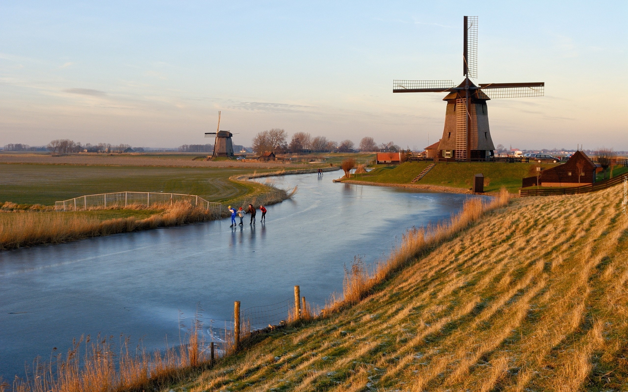 Edytor tapety: Wiatraki, Zamarznięta, Rzeka, Łyżwiaże