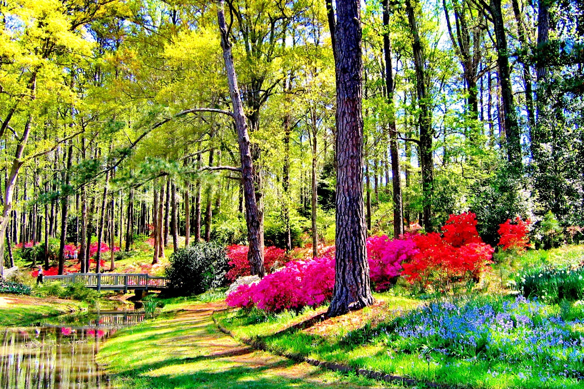 Edytor tapety: Park, Rzeczka, Mostek, Kwiaty, Różaneczniki, Wiosna