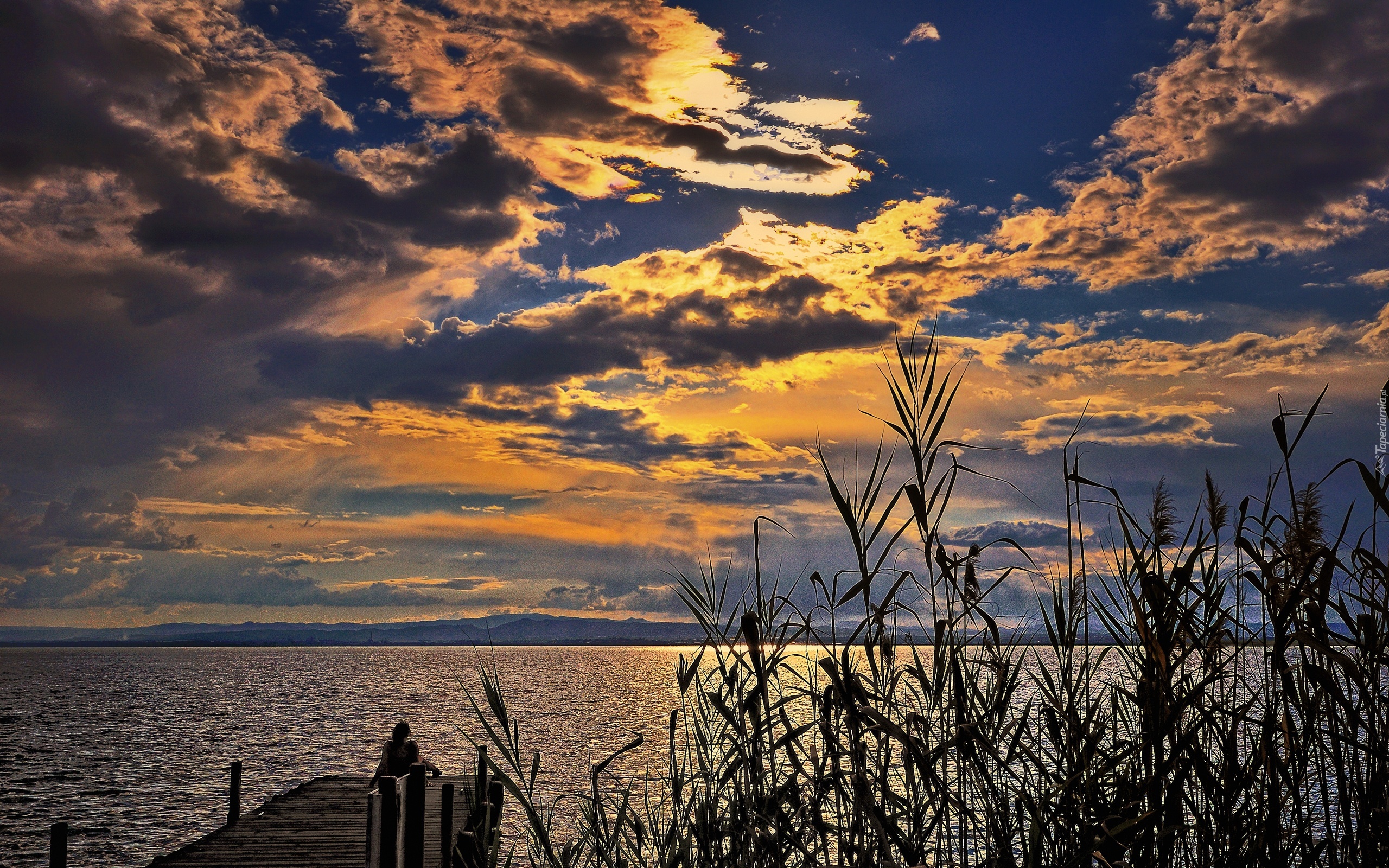 Edytor tapety: Jezioro, Pomost, Kobieta, Trawy, Góry, Chmury