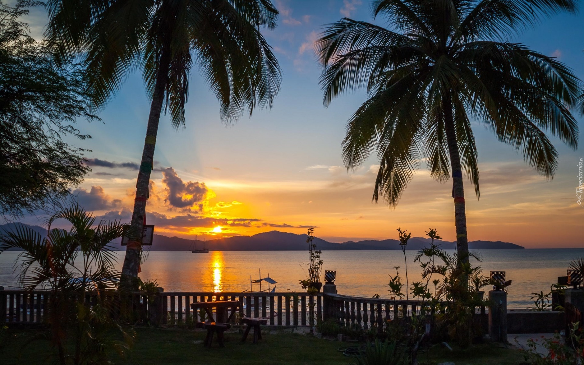 Edytor tapety: Morze, Palmy, Plaża, Łodzie, Góry, Zachód, Słońca