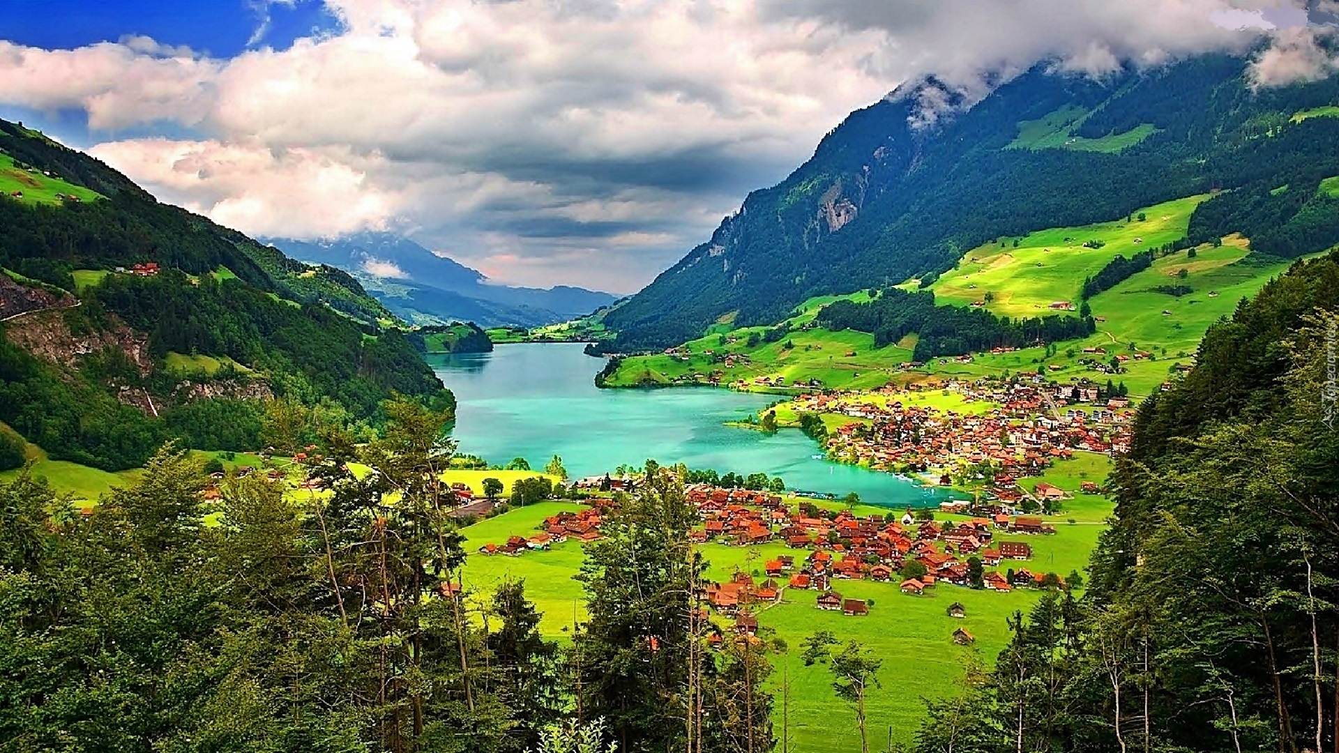 Edytor tapety: Góry, Lasy, Jezioro, Panorama, Miasteczka