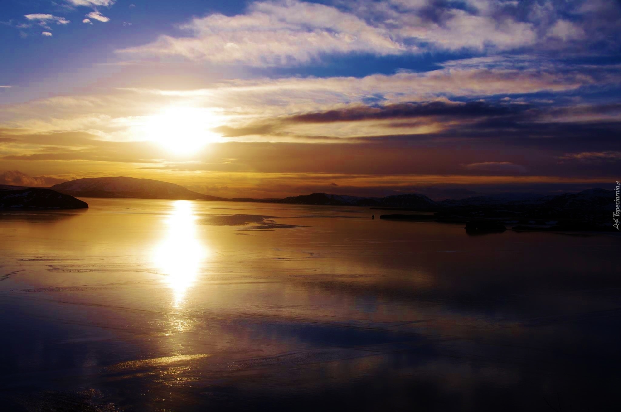 Edytor tapety: Zachód, Słońca, Jezioro, Skały